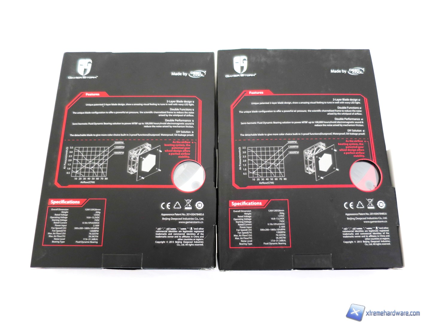 Le DeepCool TF120 ci arriveranno in una classica confezione/blister di plastica con un involucro di cartone sul quale sono riportate le informazioni tecniche ed è richiamato tramite una particolare sagomatura il design ‘’2-Layer Blade’’. Potremo infine scorgere il prodotto contenuto all’interno. Come abbiamo già detto, abbiamo ricevuto un modello a LED rossi ed uno ad LED bianchi per mostrarvi il livello di customizzazione possibile con tali modelli.