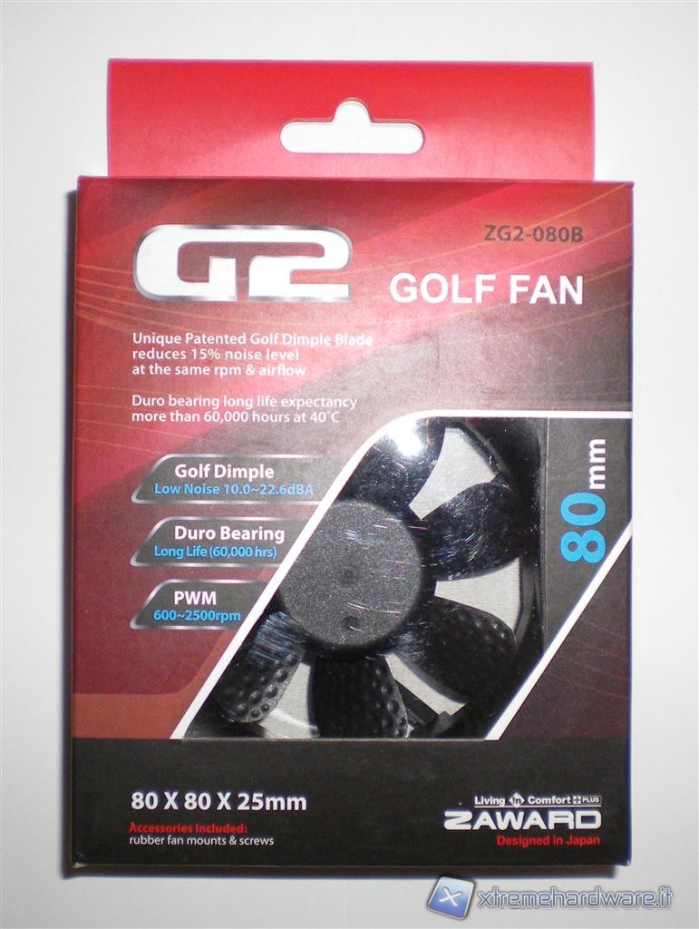La confezione si presenta con una scatola con sfondo rosso, con la descrizione di tutte le caratteristiche tecniche, modello ed altre informazioni attinenti al prodotto. In rilievo possiamo osservare la dicitura Golf Fan G2 che ci fa capire la serie del prodotto.