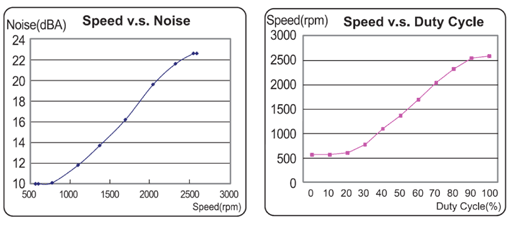 Abbiamo una portata d'aria massima pari a 36.04 CFM ed un livello di rumorosità di 10 ~ 22.6 dBA abbinate ad un voltaggio di funzionamento di 12V. Potete osservare la curva dell'emissione sonora vs Velocità e la curva Velocità vs Duty Cycle.