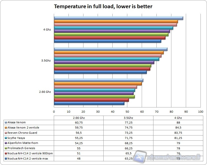 Le prestazioni ottenute dal dissipatore Reeven Chrono Guard non sono malvagie. Notiamo che a default riesce ad avere una temperatura a pieno carico di 56.5°C. Riusciamo tranquillamente ad effettuare un discreto overclock, portando infatti il nostro processore a 3.5Ghz, ottenendo a pieno carico una temperatura di circa 73°C e quindi utilizzabile senza problemi. A 4 Ghz la temperatura rilevata è di 83.75°C, temperatura limite, senza considerare che nel periodo estivo (con temperature ambiente maggiori di quelle di test) sarà sicuramente più alta.