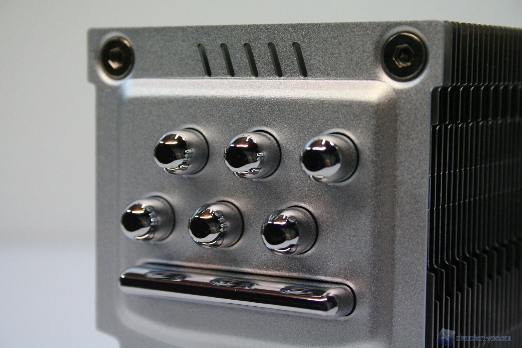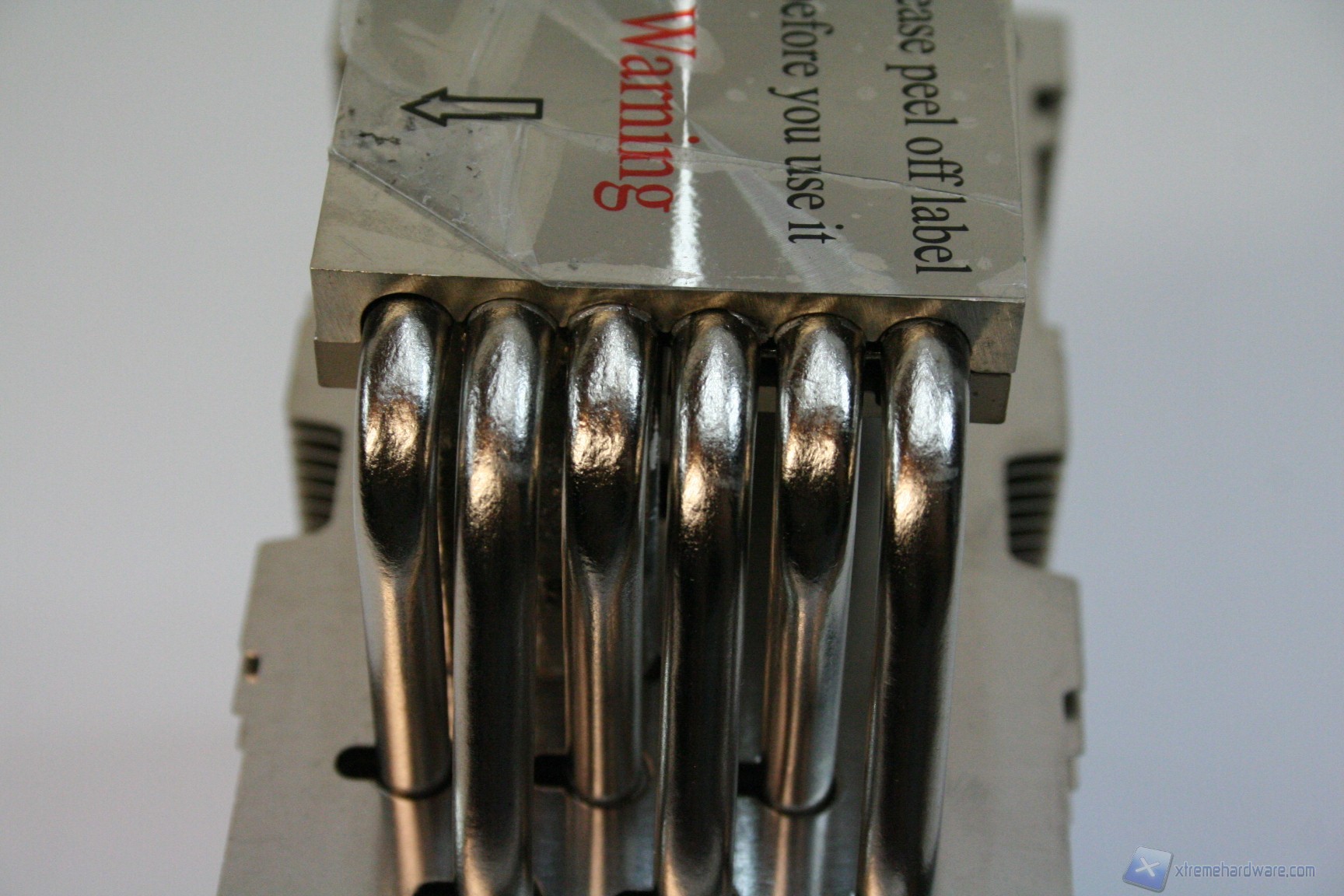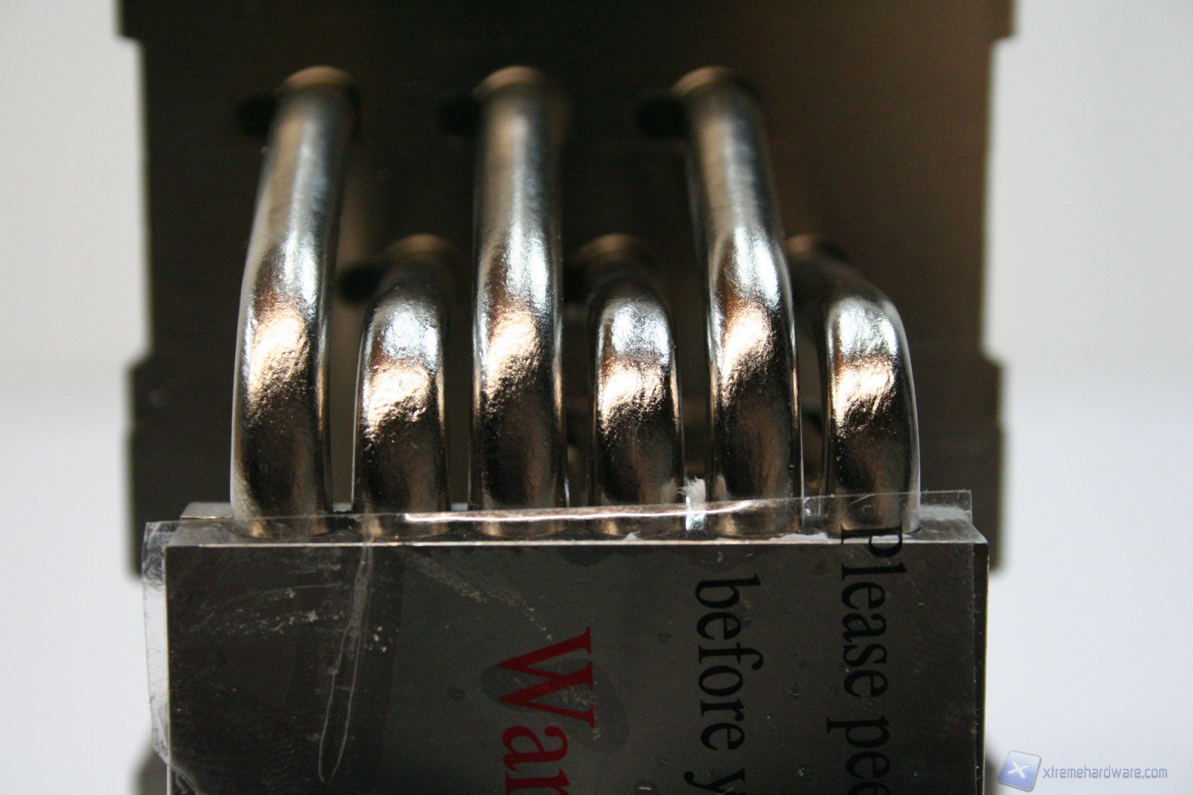 Sono presenti ben sei heatpipes da 6mm di diametro, dalla finitura in Nickel e dall’eccellente qualità complessiva. Presentano una scudatura terminale di grandissimo livello in quanto la lavorazione, come la finitura sono eccelse, sia per le heatpipes che per le due camere di vapore. Sono saldate alle alette quindi ci sarà un’efficienza di scambio di calore migliore rispetto alla sola punzonatura. La superficie dissipante è elevata, sebbene non così elevata rispetto ai dissipatori a doppia torre, però riuscirà certamente a gestire CPU molto potenti, quindi ovviamente ciò comporta prestazioni elevatissime con CPU dal basso consumo. Nella parte superiore è presente una piccola paratia di protezione terminale con inciso il logo del marchio.