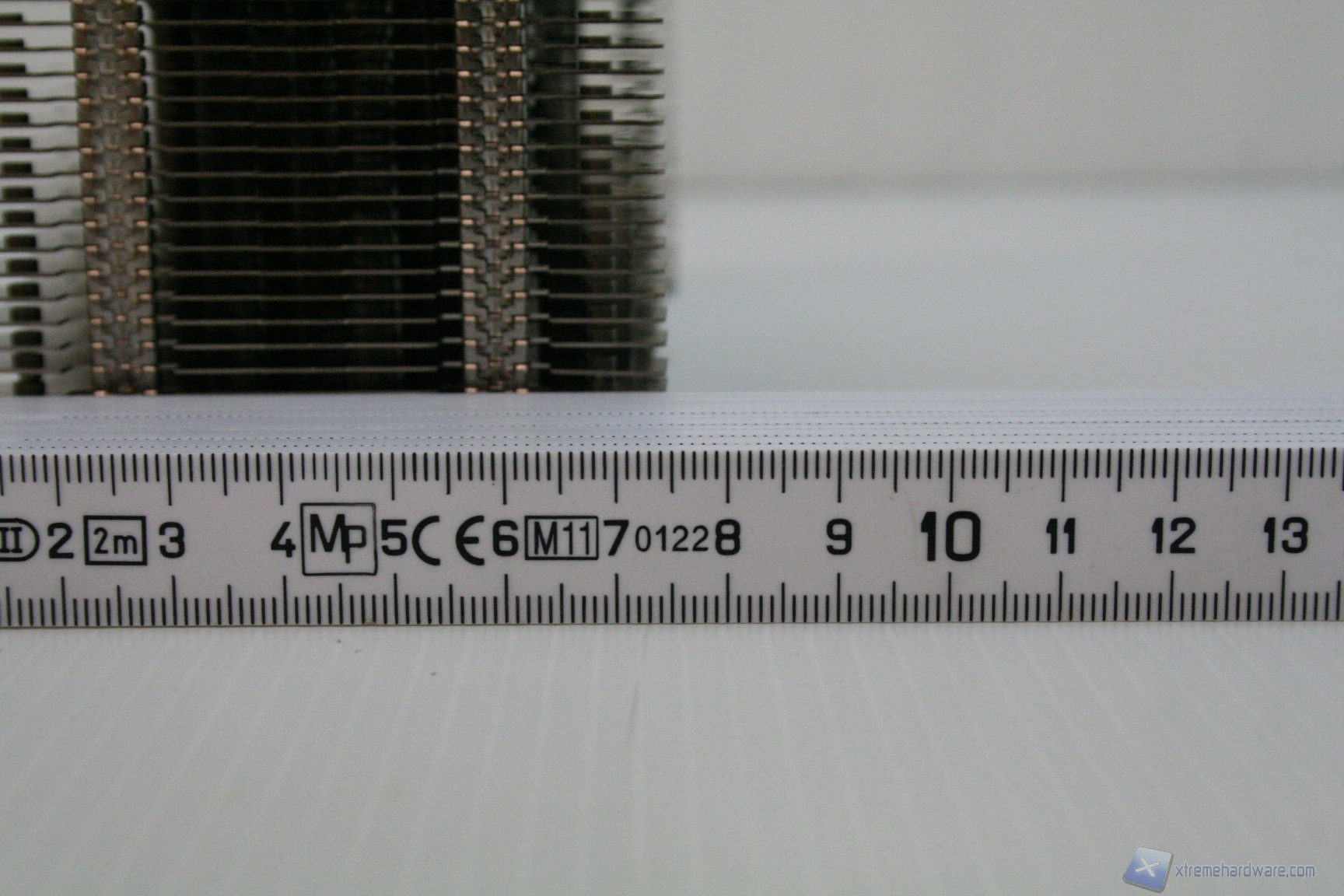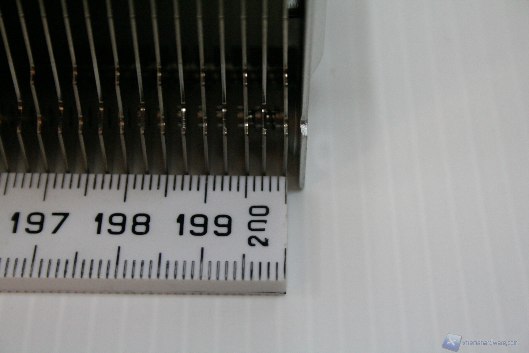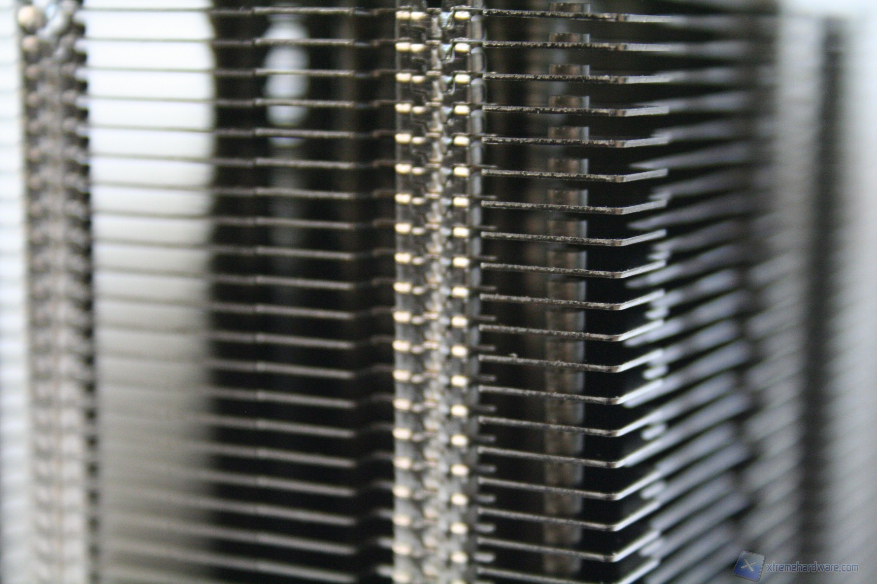 Al fine di migliorare la ventilazione centrale è presente una rientranza, presente anche nelle parti sinistra e destra ma con una profondità minore. La spaziatura delle alette è di 1.8mm, un valore contenuto che quindi permetterà ottime performance con ventole dall’elevata pressione statica, o elevatissimi CFM. Lo spessore invece è circa di 0.4mm, un valore medio-grande.