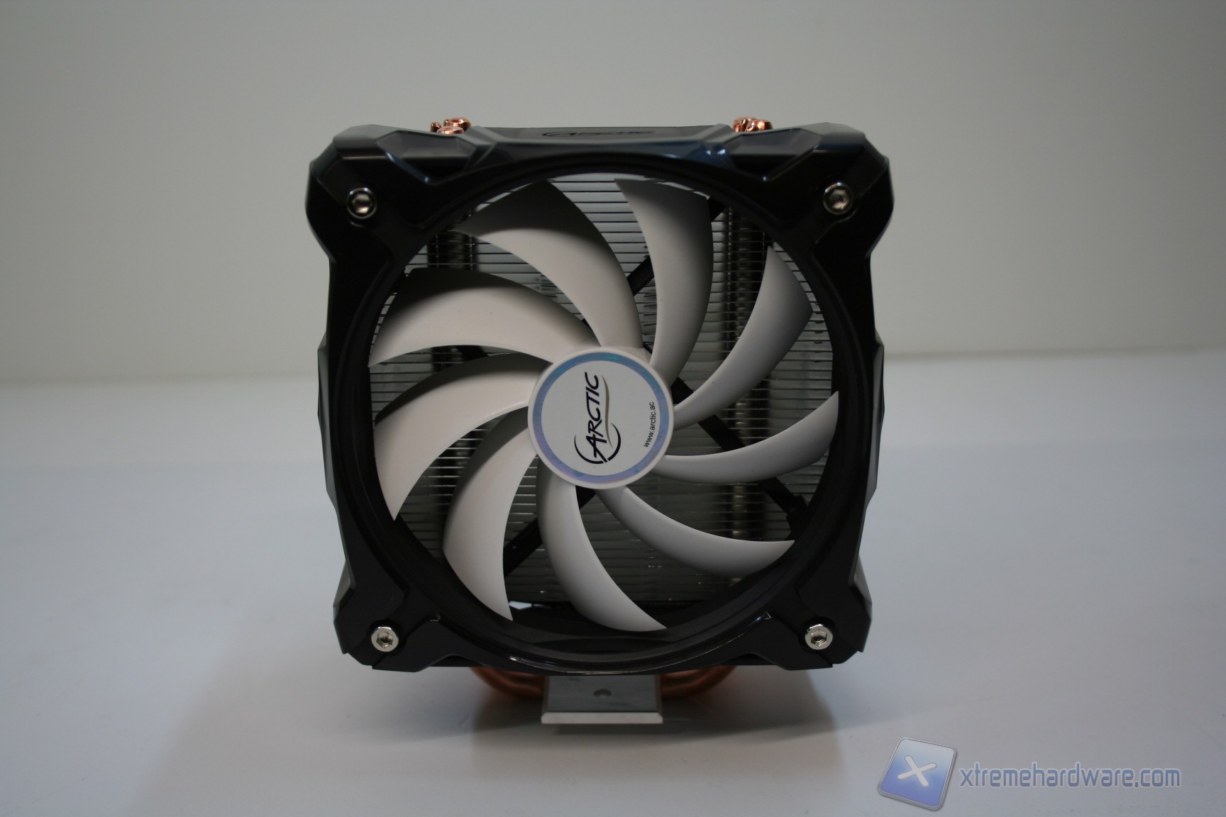 Con il Freezer i30 viene fornita in dotazione al bundle una ventola Arctic Cooling F12 da 120 mm PWM, sostituibile con un qualsiasi modello di pari dimensioni e con maggiori prestazioni. La ventola come possiamo notare è sostenuta da un frame in plastica rigida e da quattro viti-perno antivibrazione che la separano dal corpo del dissipatore. Il design della ventola F12 è molto sobrio, notiamo infatti un semplice contrasto bianco – nero.