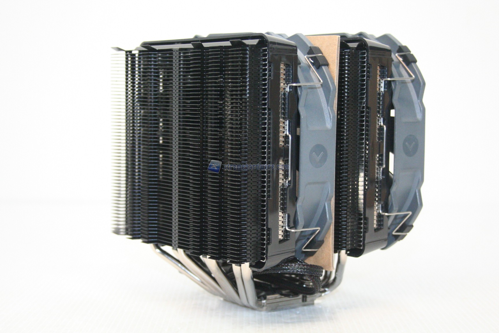 La finitura in nichel, associata al cappuccio terminale arrotondato ed al plate superiore nero, dona un impatto estetico forte, una pulizia nelle linee notevole ed una solidità strutturale su ottimi livelli. Il sistema di aggancio delle ventole inoltre si caratterizza per una cornice di plastica rigida da incastrare nelle due torri del radiatore, il che quindi agevola la procedura di assemblaggio delle stesse. Presenta una configurazione stock in configurazione 2x Push (Ventola centrale e ventola frontale, che spingono verso la torre posteriore) ma è addirittura possibile aggiungerne una terza, il che quindi ne amplifica le potenzialità. La superficie dissipante è molto elevata e quindi ovviamente sarà capace, in linea teorica, di gestire CPU aventi un TDP anche molto maggiore dei canonici 130W.