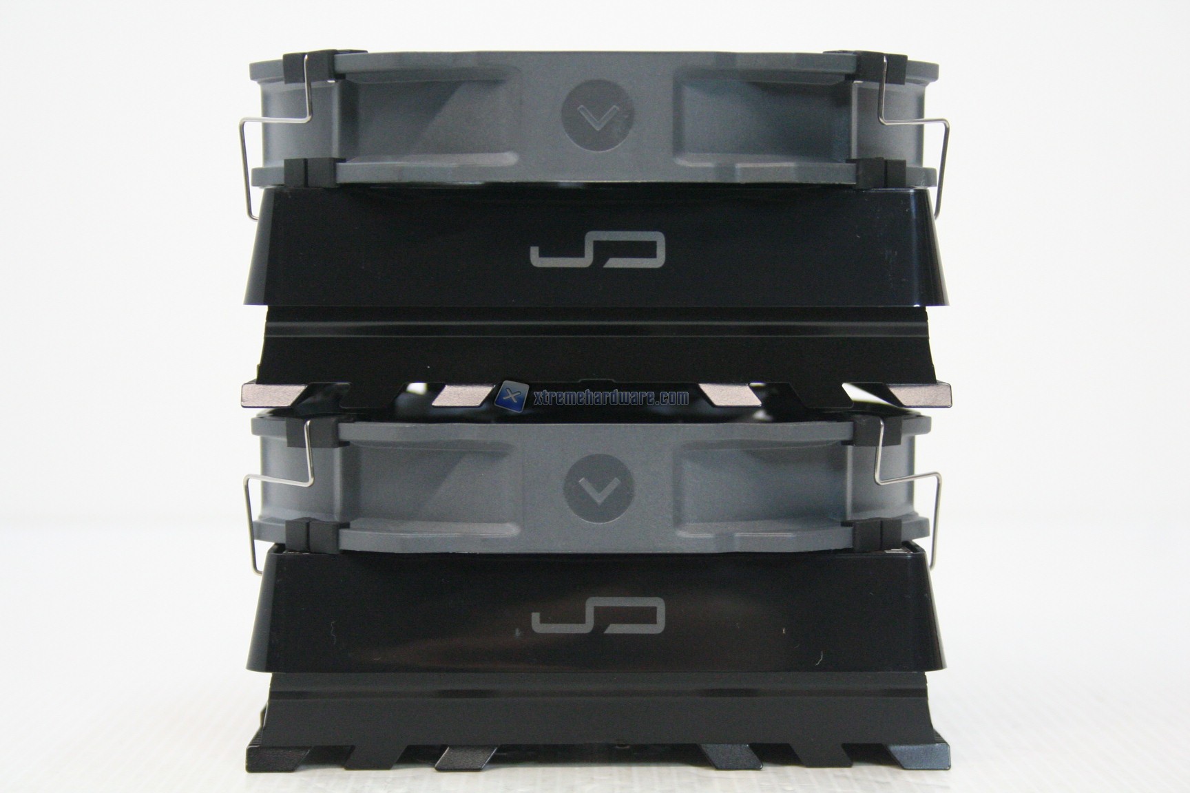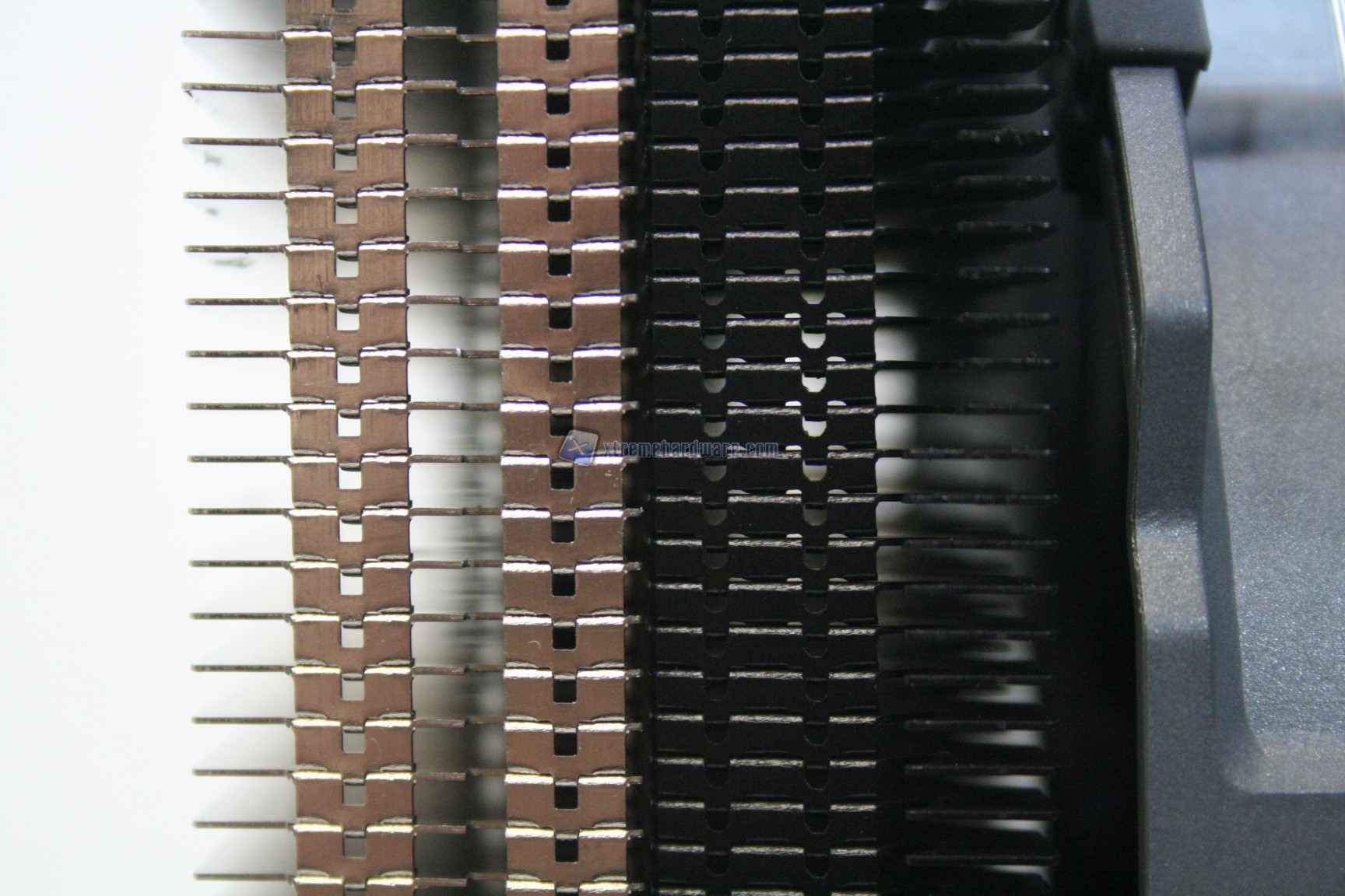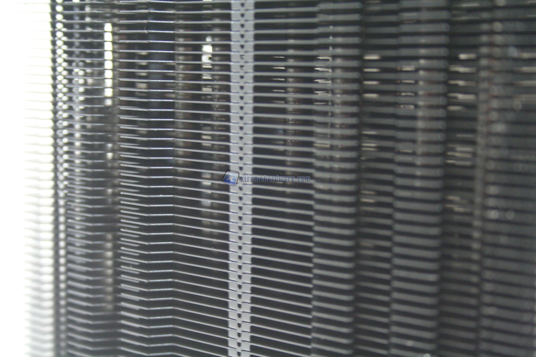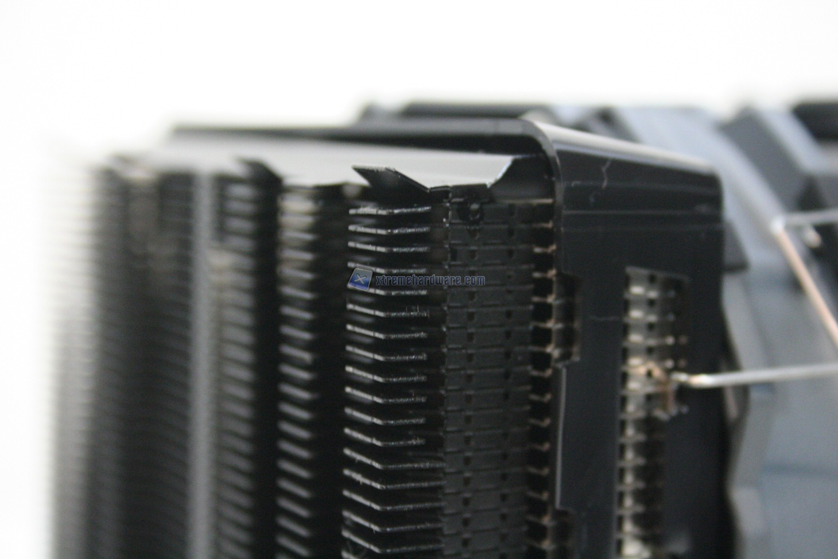 Una delle particolarità di questa doppia torre è appunto il fatto che sono state utilizzate due diverse tipologie di alette, con spaziatura diversa. Si evince dalle fotografie del radiatore, notiamo infatti la presenza di due colorazioni, nera e argento (Finitura in Nickel). Partendo dalla porzione frontale, troviamo il radiatore con alette più distanziate, che poi permetteranno l’immissione dell’aria al blocco successivo (nero), portando quindi ad una compressione verticale dei flussi e quindi ad una velocità di spinta maggiore. Questo sistema prende il nome di "Jet Fin Acceleration System", anch’esso brevettato. Ormai Apple insegna, proponiamo di brevettare anche il sistema "I breathe, I pay Government Air TAX System"; si avvicinano le elezioni in Italia, non sia mai che basti solo il 22% di IVA o il 50-60% di tassazione sui privati, anvanti con la finanza creativa!