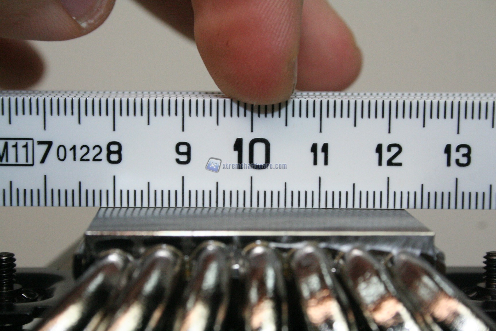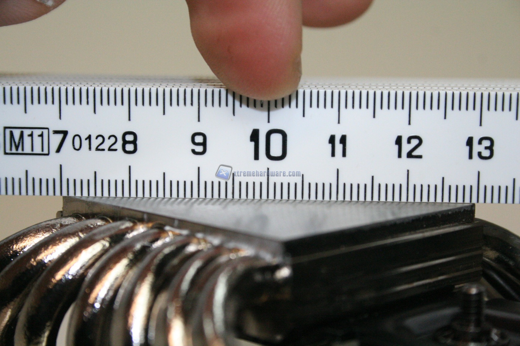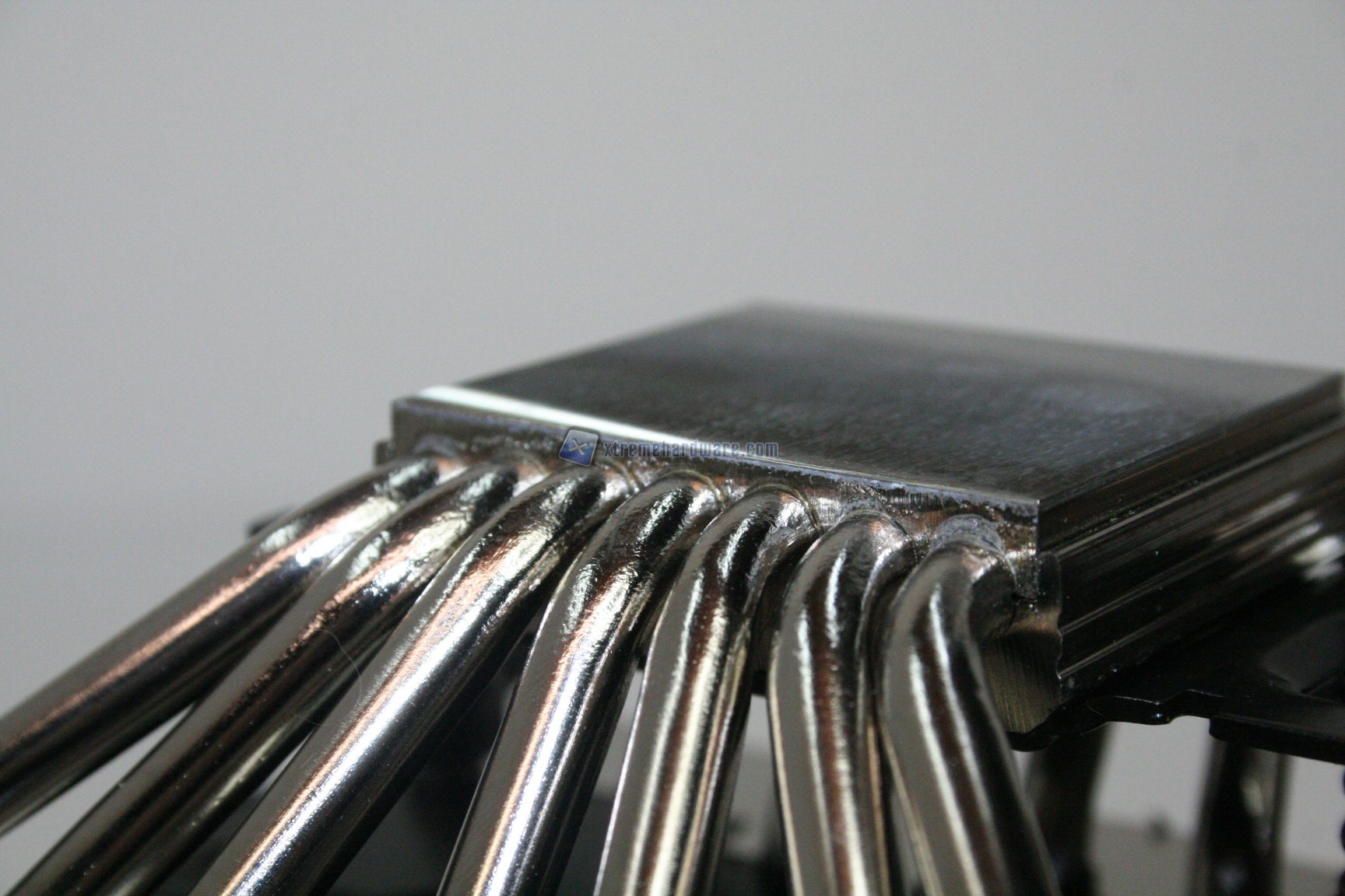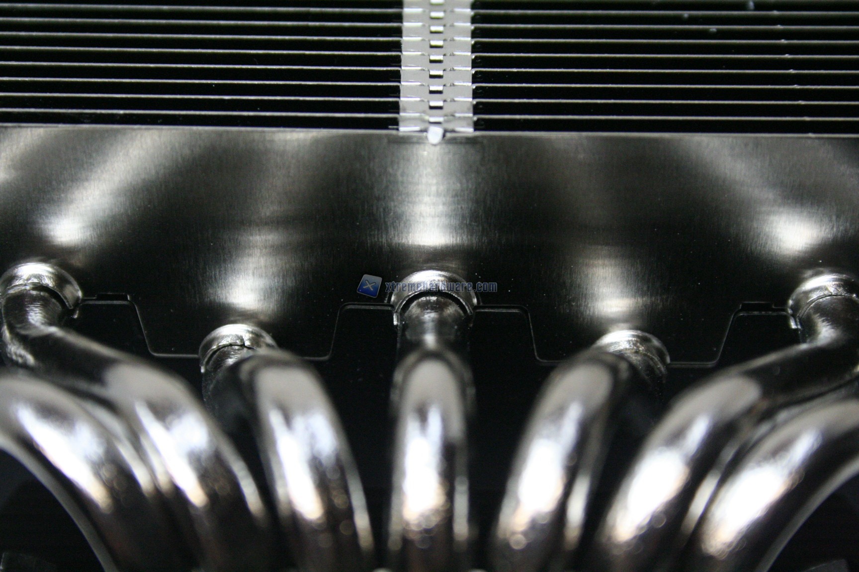 La curvatura sulla base è intenzionale poiché ovvia a problematiche potenziali di contatto con l’IHS della CPU spesso ricurvo a causa del sistema di ritenzione della scheda madre. Sul socket LGA 2011, questo problema non è presente e tale accorgimento non è a nostro avviso necessario: anche i dissipatori con superficie perfettamente planare generalmente riescono ad avere un’ottima impronta e quindi buone prestazioni.
