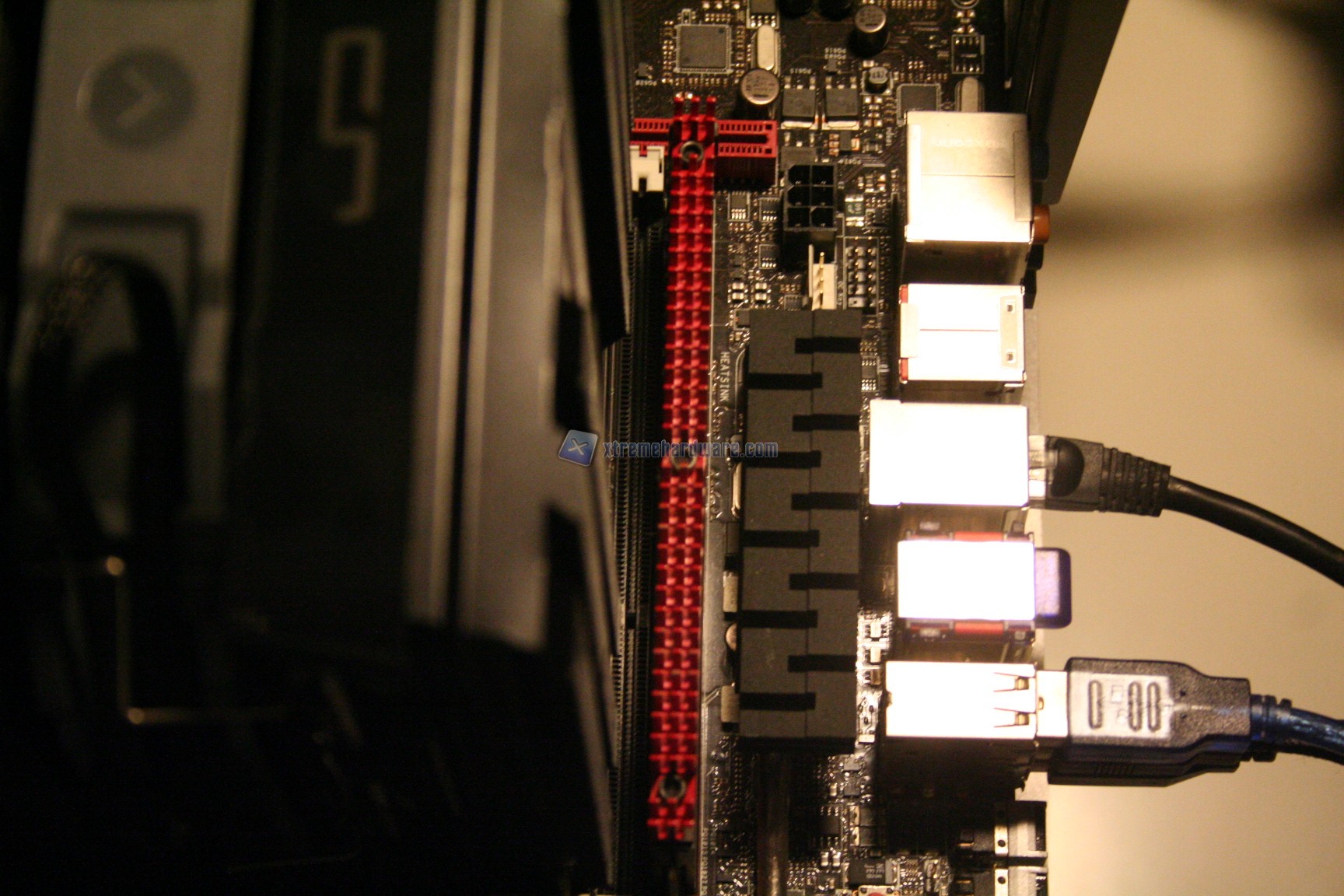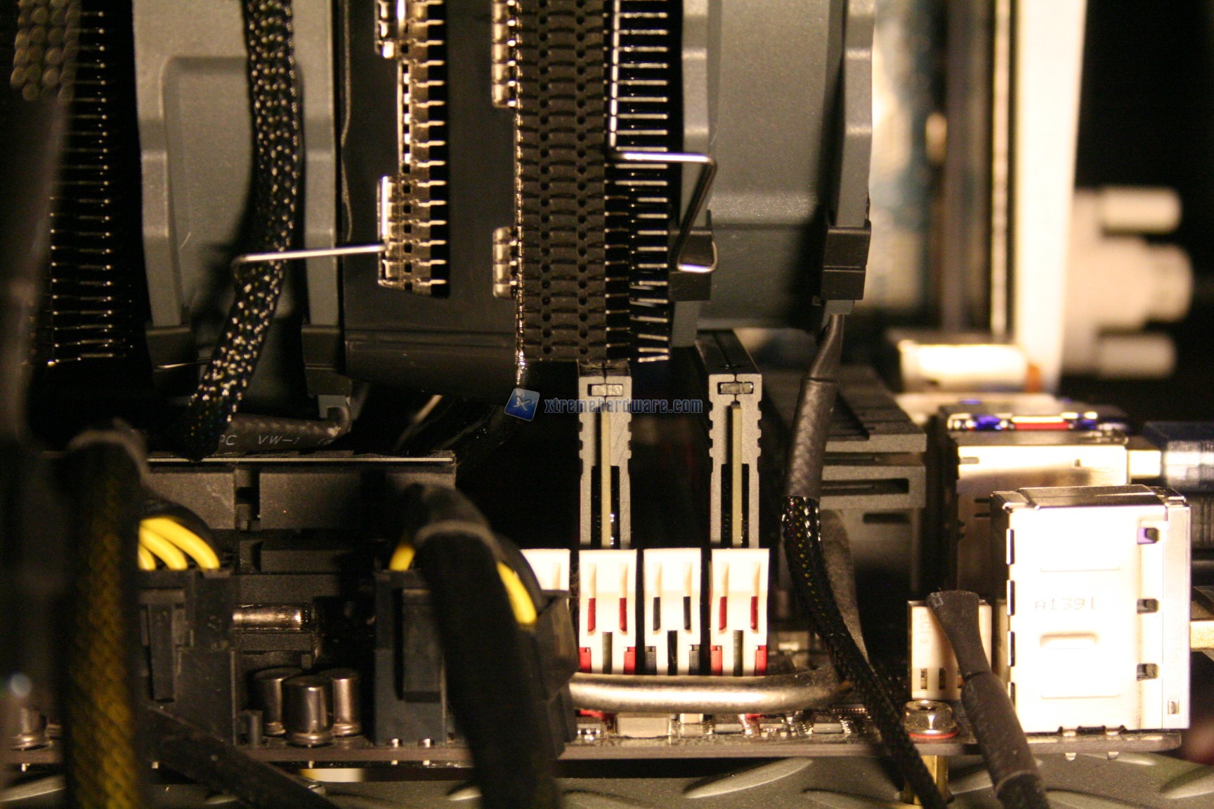 Su una RIVE X79 bisogna rialzare leggermente sia la ventola frontale, sia quella posteriore, perché altrimenti vengono occupati diversi slot di RAM e ciò sarebbe inaccettabile. A conti fatti la configurazione triventola da 140mm è adatta a socket che non siano il 2011, aventi quindi RAM spaziate poste solo frontalmente. Posteriormente infatti la situazione come vedete può essere ancora più problematica, per via della struttura asimmetrica delle due torri dissipanti: