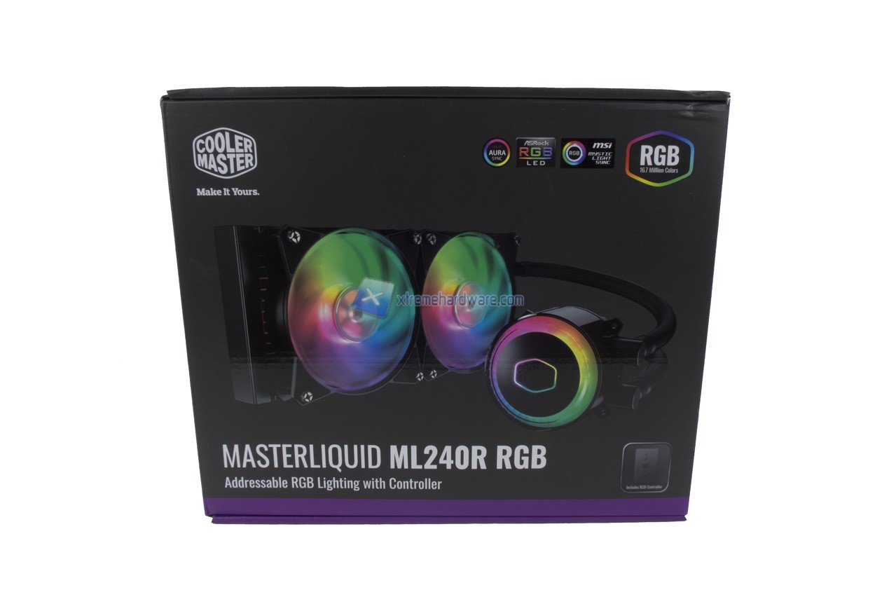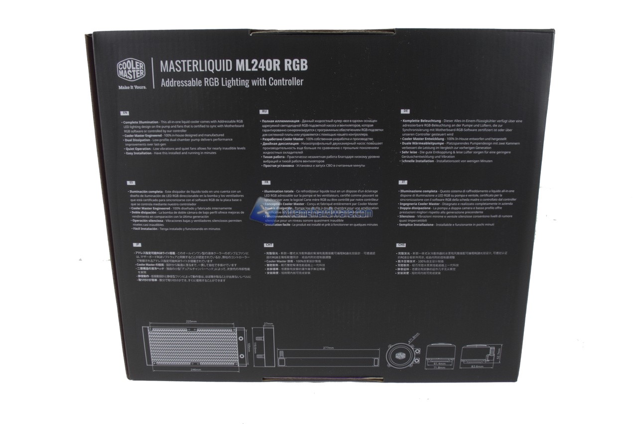 Il Cooler Master MasterLiquid ML240R RGB arriva nella classica confezione di cartone abbastanza robusto. Su questa troviamo frontalmente una bella immagine del prodotto insieme alla compatibilità dell’illuminazione RGB con i software e tecnologia dei principali brand di schede madri. Gli altri lati della confezione riportano informazioni, caratteristiche tecniche e dimensioni del prodotto.