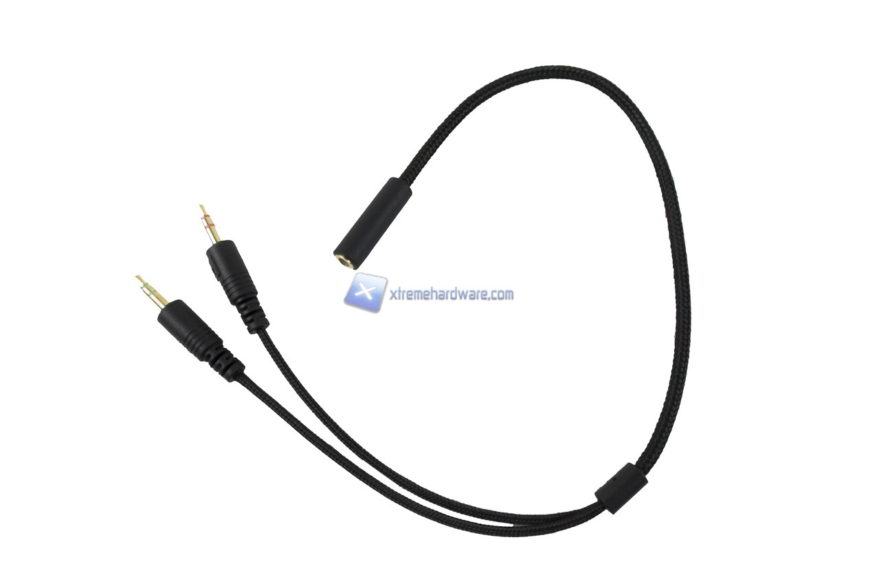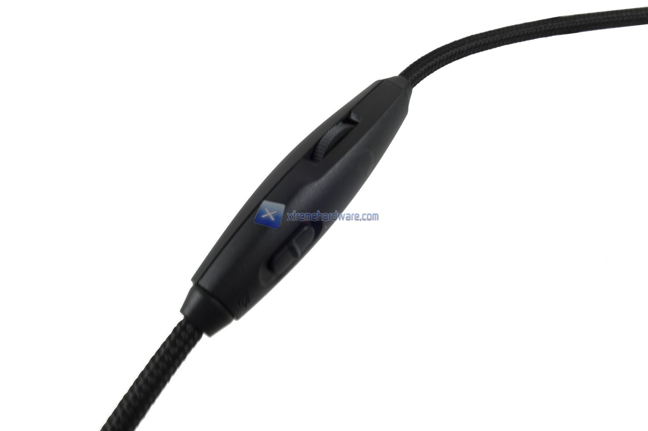 Dettaglio del controller sul filo con possibilità di attivare/disattivare il microfono oltre che di regolare il volume generale. Il cavo è rivestito in treccia di tessuto.