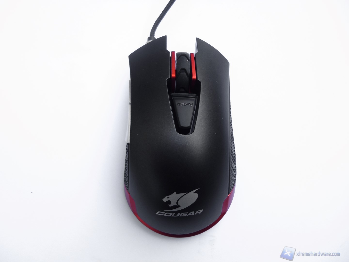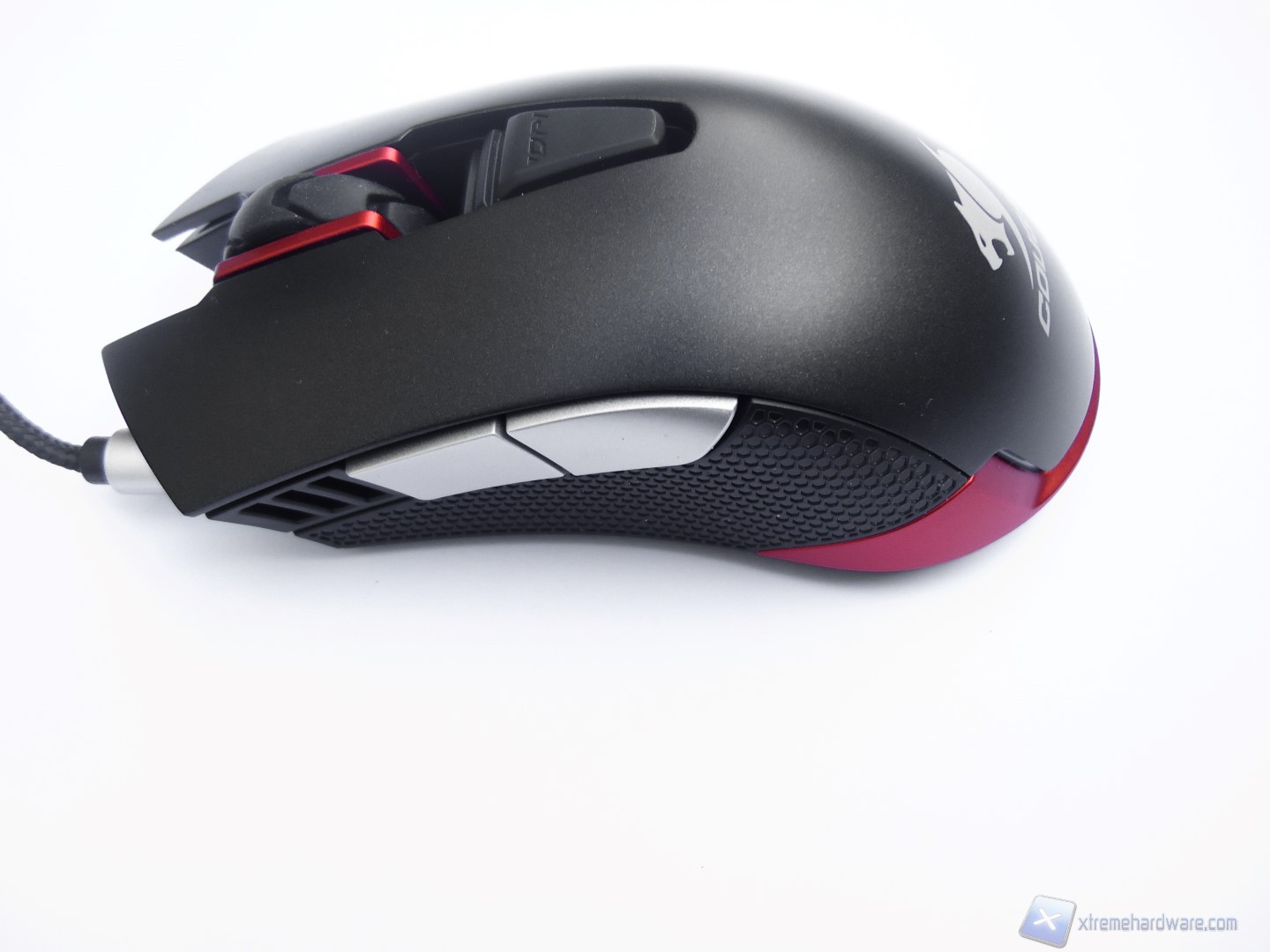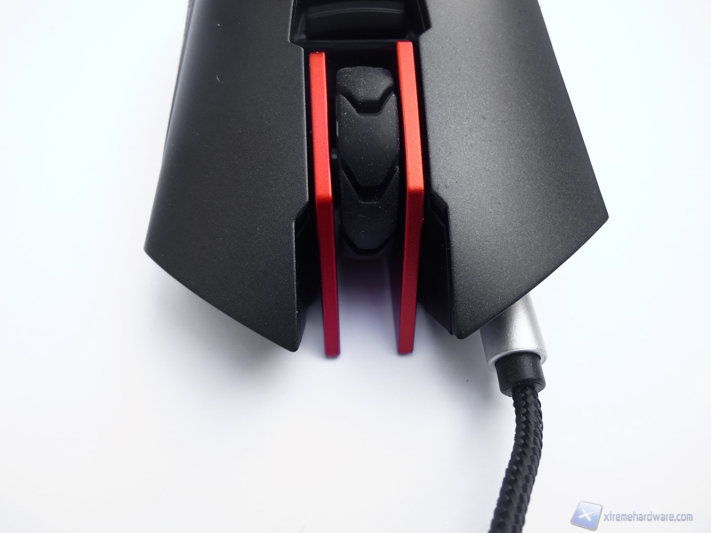 La parte frontale del mouse si distingue per un design davvero aggressivo e dalla presenza, oltre che dei tasti descritti fino ad ora, del connettore da dove si estende il cavo USB rivestito in treccia di tessuto.