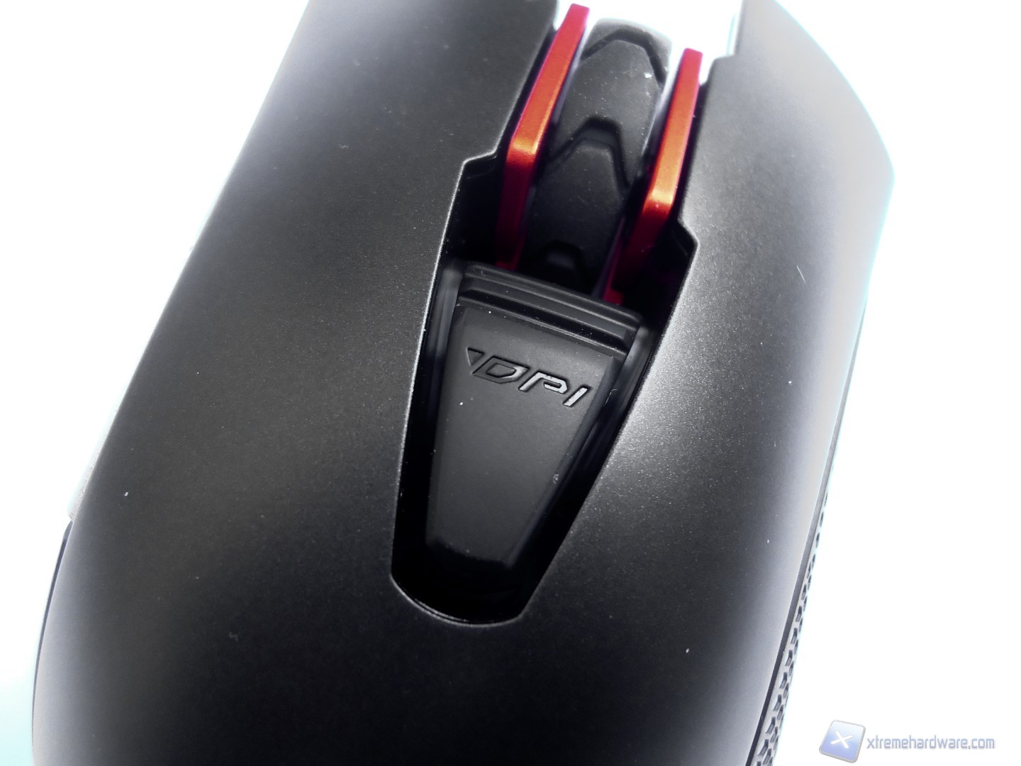 Analizziamo il dorso del mouse che presenta, oltre ai classici tasti click destro e sinistro, anche il pulsate dedicato allo switch on the fly della risoluzione del sensore, ad azionamento orizzontale per impedire di premerlo inavvertitamente durante il gioco. La rotellina del mouse è rivestita interamente in gomma, con una texture simile a quella di uno pneumatico da corsa ed è incastonata all’interno di due parti in plastica arancioni che danno al mouse un design davvero aggressivo. Lo scroll presenta solamente il tasto click centrale, mentre mancano quelli laterali. Nella parte posteriore del prodotto è presente il logo dell’azienda in colorazione grigia e più in basso troviamo l’enorme striscia LED, che si estende per tutta la larghezza del mouse, e che separa la parte in plastica nera da quella arancione. Questi LED sono RGB e possono assumere fino a 16.8 milioni di colori diversi.