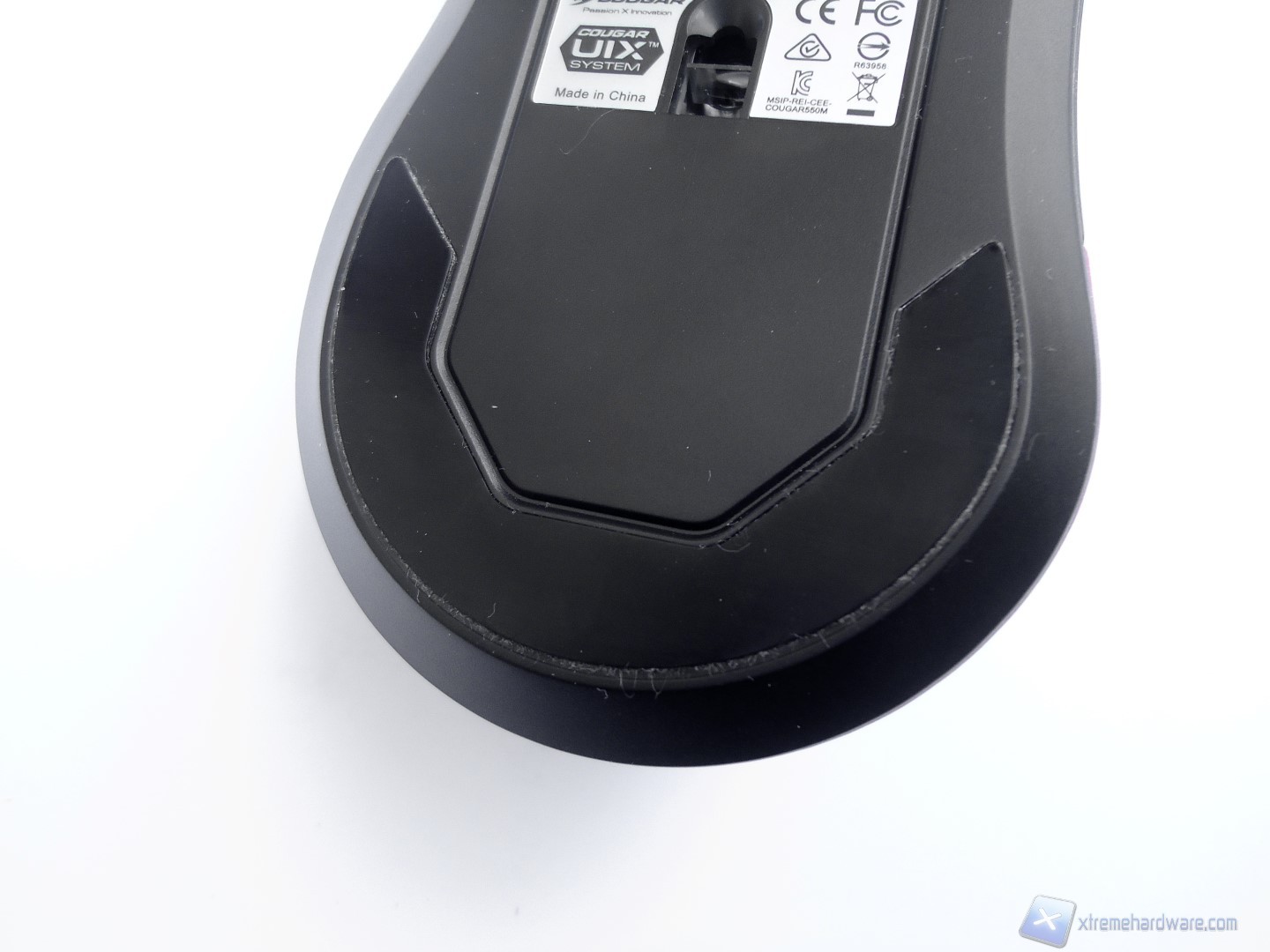 Capovolgendo il mouse, mostriamo, come da foto, la superficie di contatto del mouse con il mousepad. Al centro troviamo il sensore Pixart da 6400 DPI il quale è circondato da 3 piedini in teflon che assicurano un’ottima scorrevolezza su quasi tutte le superfici, ma che tendono a deteriorarsi molto in fretta nel tempo se usati su mousepad rigidi e ruvidi. Oltre a questi elementi sono riportate le varie certificazioni del prodotto e altri piccole informazioni sul prodotto.