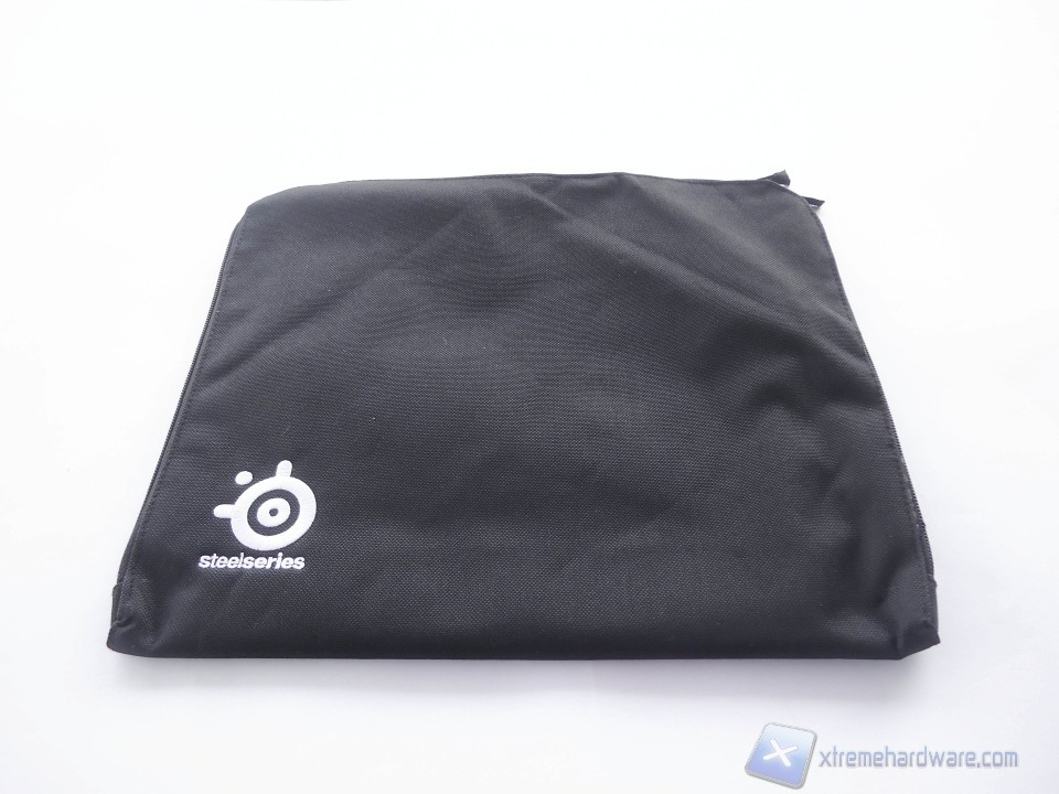 Aperta la confezione la prima cosa che ci sorprende sono i numerosi accessori compresi con questo oggetto. Come prima cosa troviamo un astuccio in tessuto per contenere il mousepad, molto utile se doppiamo trasportarlo per qualche lan-party. L’astuccio può essere convertito anche in borsa per netbook e tablet grazie alle sue notevoli dimensioni.