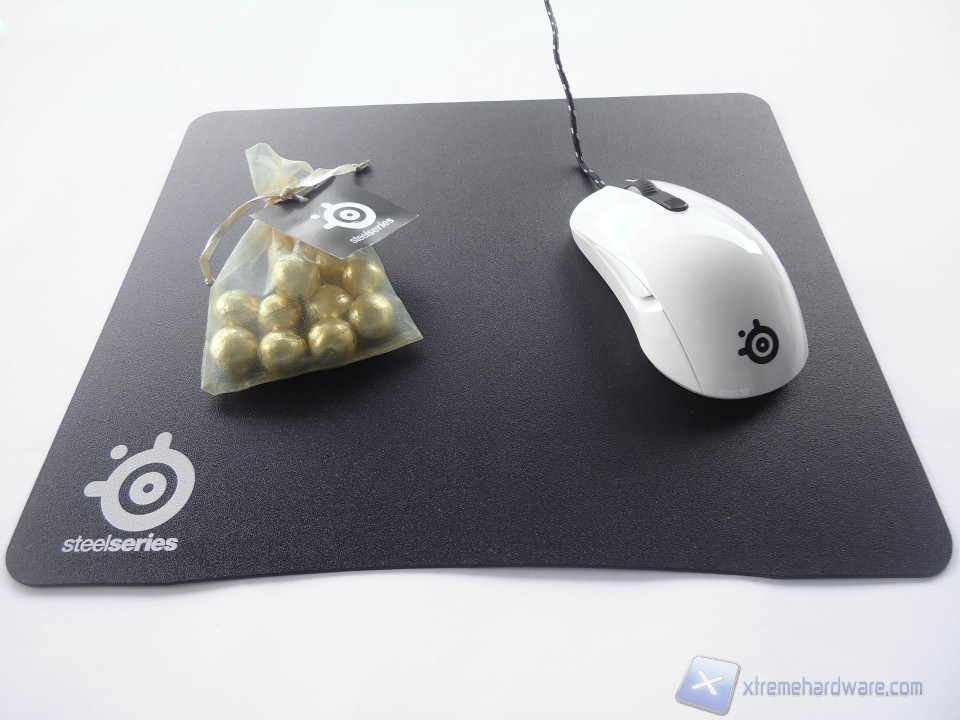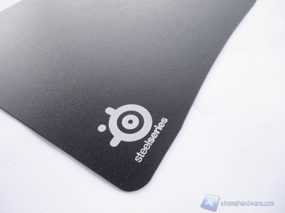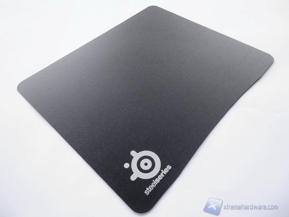 Passando al mousepad vediamo che ha una forma non prettamente squadrata ma è arrotondato e leggermente concavo nella parte inferiore. La superficie è ruvida ed è causa di un discreto rumore quando ci facciamo scorrere sopra il mouse. In basso a sinistra troviamo il logo SteelSeries di colore bianco. Le sue dimensioni sono 320 X 270 X 2 mm.