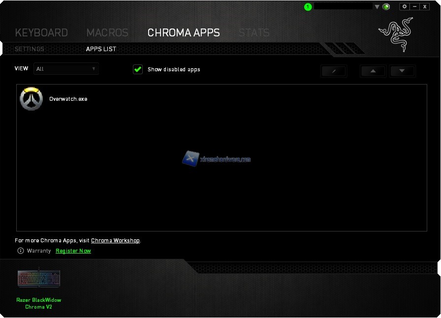 Menù ‘’Chroma Apps’’. Razer da quando ha creato il sito Chroma Workshop ha messo a disposizione una vasta raccolta di applicativi compatibili con il sistema Chroma nonché diversi effetti da scaricare e importare successivamente per i più famosi giochi tra cui il più recente Overwatch.