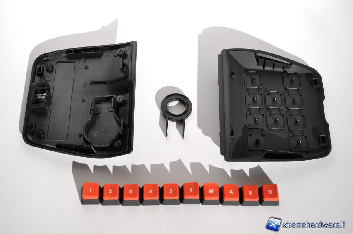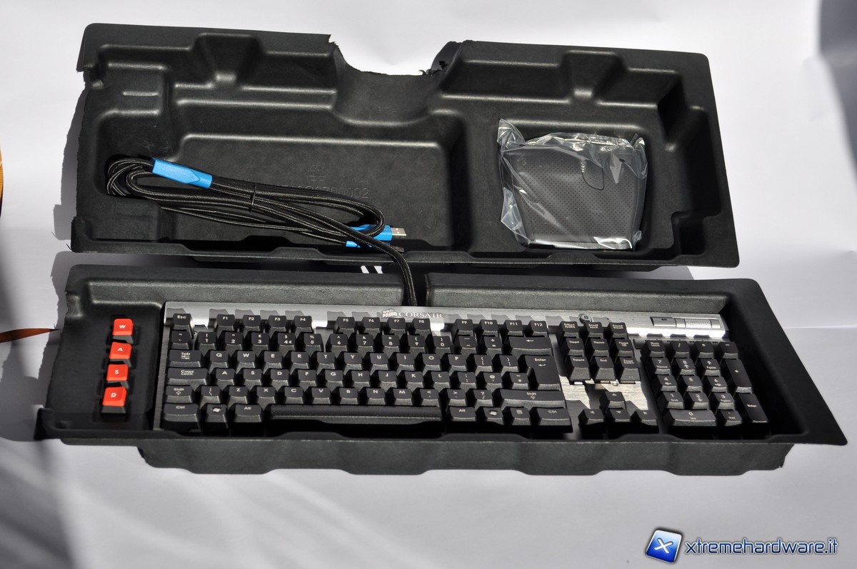 Il bundle, oltre alla tastiera, conta diversi elementi interessanti. A parte un piccolo manuale delle istruzioni (davvero essenziale, con sole immagini) e il libretto della garanzia, nella scatola sono presenti un poggia-polso che funge anche da pratica custodia per i tasti, 10 tasti intercambiabili per il gaming (per la precisione i tasti: 1, 2, 3, 4, 5, 6, W, A, S, D) e uno strumento studiato per rendere più agevole la sostituzione dei tasti. Il poggia-polso, come è già stato scritto, funge anche da custodia dove poter alloggiare i 10 tasti da gaming e l’apposito strumento per smontare i tasti della tastiera.