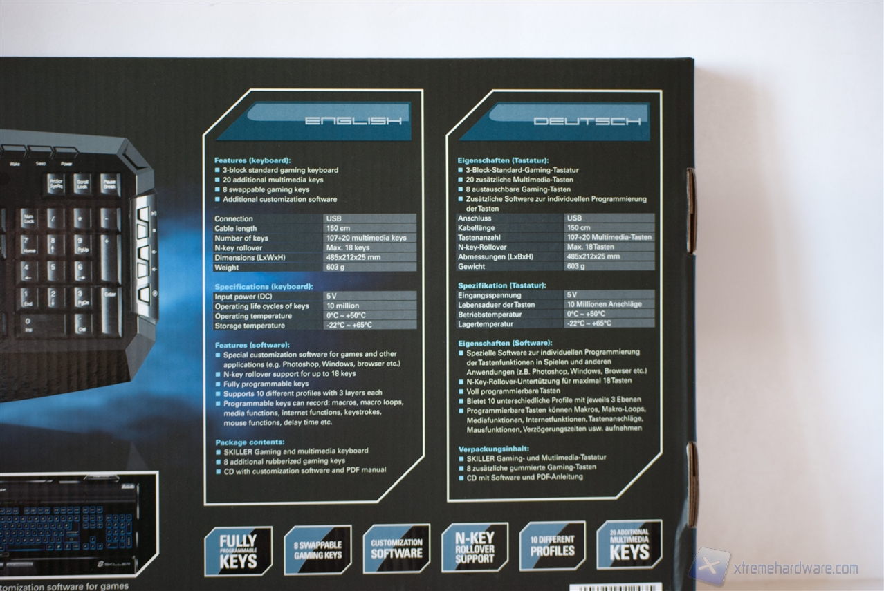 Come per la sorella Skiller, il retro della confezione riporta l’immagine della tastiera, le due tabelle, una in inglese e una in tedesco, riportanti le caratteristiche tecniche nel dettaglio e delle immaginette relative ad alcune features, quali tasti aggiuntivi, tasti a basso profilo e bottone per l’illuminazione dei tasti.
