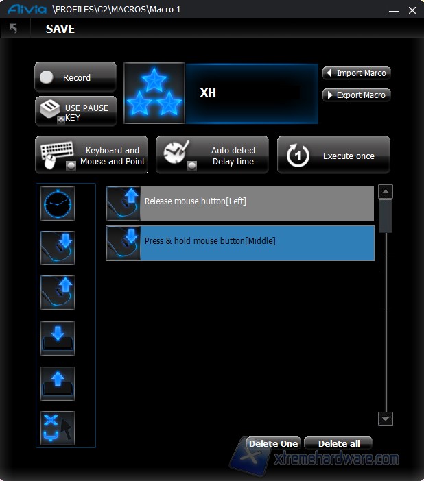La modalità di esecuzione della macro è definita all'interno della macro stessa, in fase di registrazione, è possibile registrare anche un movimento del mouse grazie alle coordinate assolute X Y relative al bordo sinistro-alto dello schermo. È inoltre possibile importare ed esportare le macro.