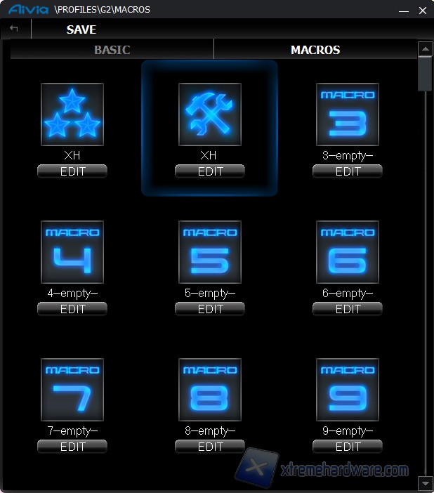 Profili è la tab dedicata alla mappatura dei 5 tasti macro aggiuntivi. Per ogni tasto è possibile selezionare una delle diverse funzioni prestabilite (ad esempio l'avvio del player musicale, il doppio click, back nel browser etc) oppure caricare una macro che si può configurare facilmente mediante il pulsante Edit.