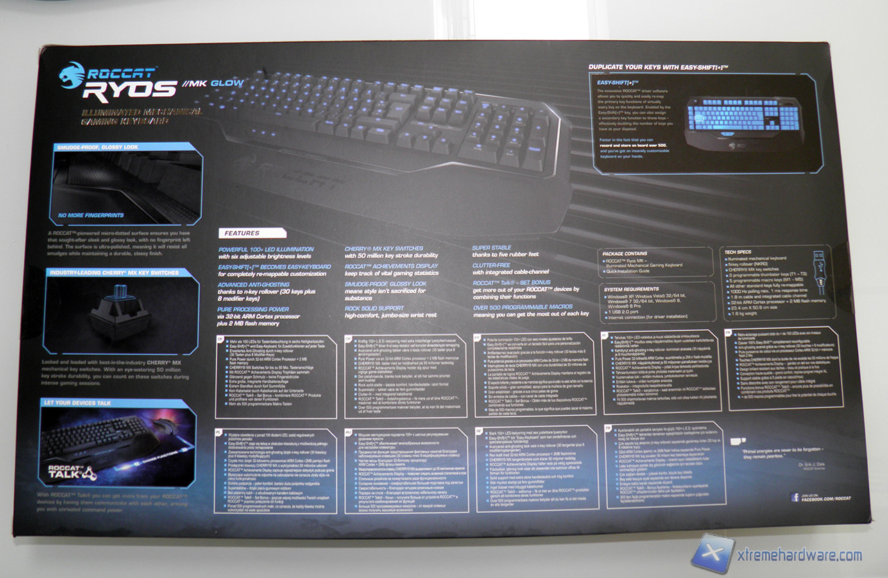 Non manca una grande immagine raffigurante la tastiera, mentre nella parte posteriore, oltre ad alcuni dettagli della tastiera messi in evidenza, troviamo anche una lista dettagliata delle specifiche tecniche della Ryos MK Glow.