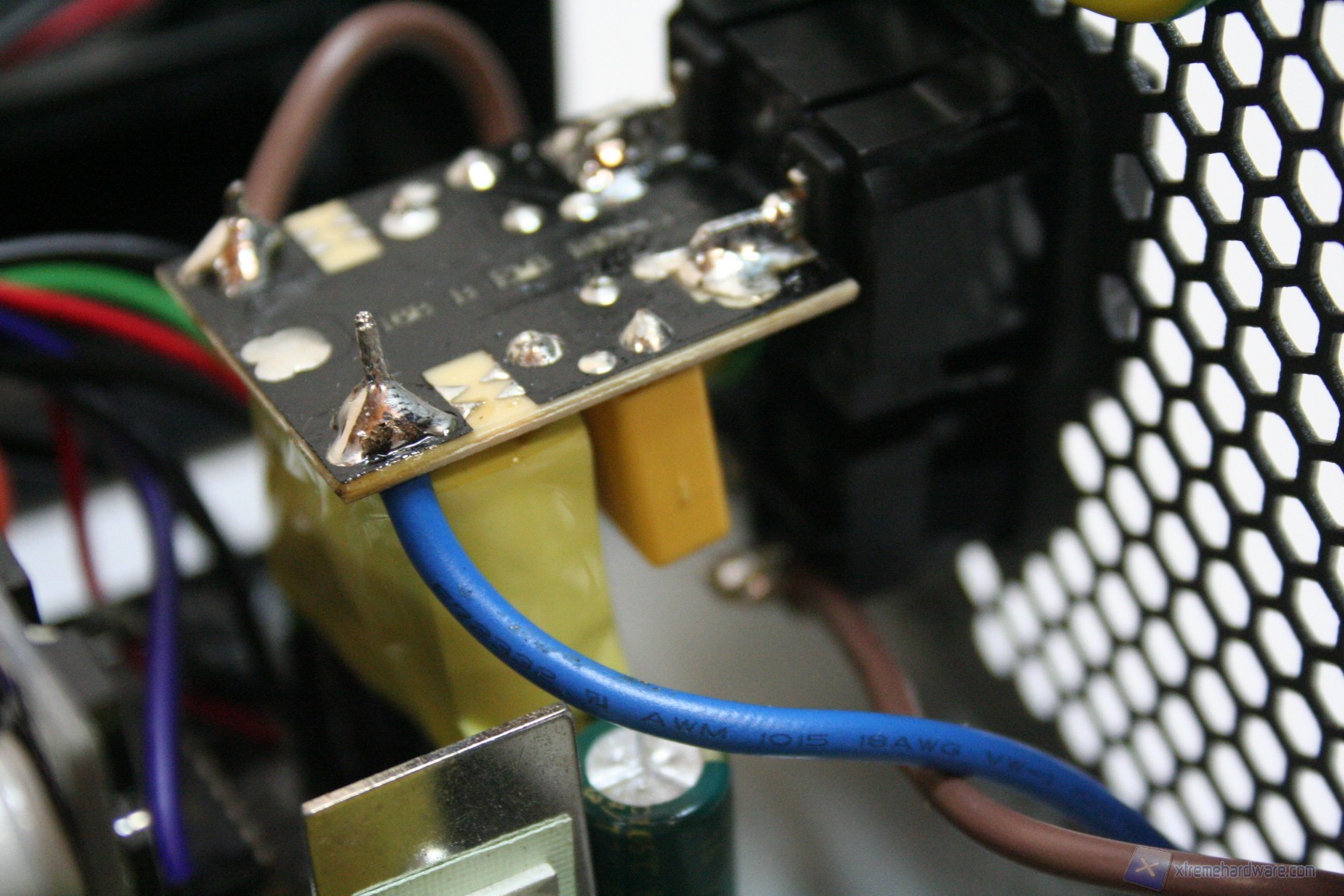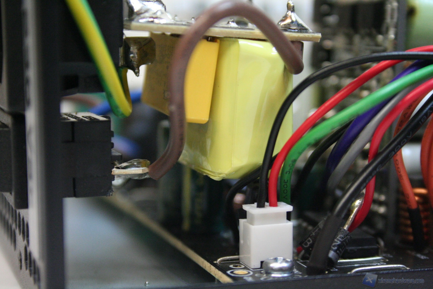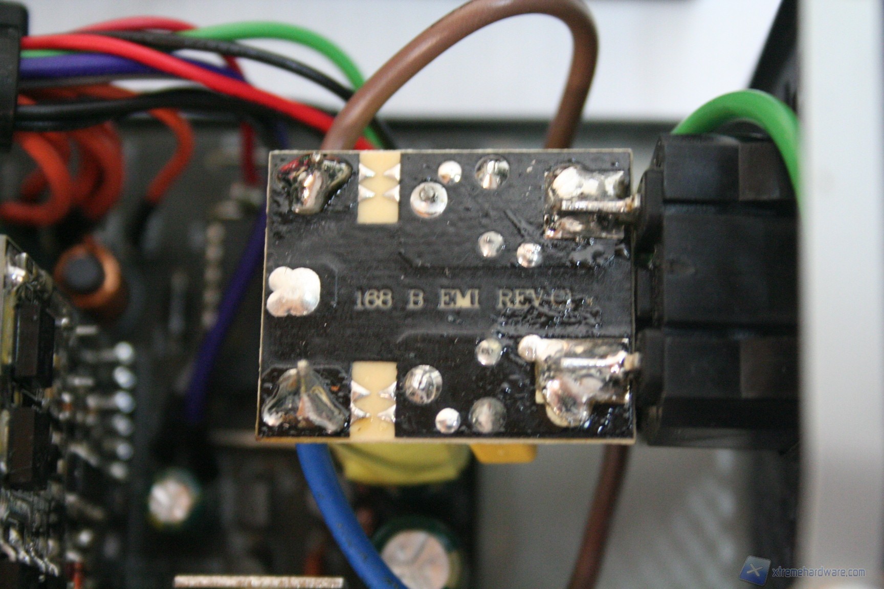 Il primo elemento di un alimentatore moderno è il sistema di filtraggio delle emissioni elettromagnetiche e radio, precisamente l’EMI/RFI Transient Filter. Viene posizionato necessariamente dietro all’ingresso della corrente AC  e  sono state incluse le necessarie componenti affinché non ci siano interferenze elettromagnetiche, tra cui un condensatore ad X ed un induttore sul PCB superiore, un condensatore ad X su quello principale ed un altro induttore e sempre su quest’ultimo troviamo due condensatori ad Y, oltre ad un varistore (MOV, Metal Oxide Varistor) ovvero sostanzialmente una resistenza, voltaggio-dipendente, che protegge l’alimentatore ed il sistema da picchi di voltaggio provenienti dalla rete elettrica esterna. Vi ricordiamo che se un alimentatore non è dotato di un MOV nell’EMI/RFI Transient Filter si dovrebbe sempre utilizzare il proprio sistema con un gruppo di continuità (o UPS), che agirà da filtro a protezione dei picchi di voltaggio; questi ultimi potrebbero danneggiare seriamente non solo l’alimentatore stesso ma anche l’intero sistema! Di solito questa componente viene rimossa per ragioni di costo di produzione, e progettazione.