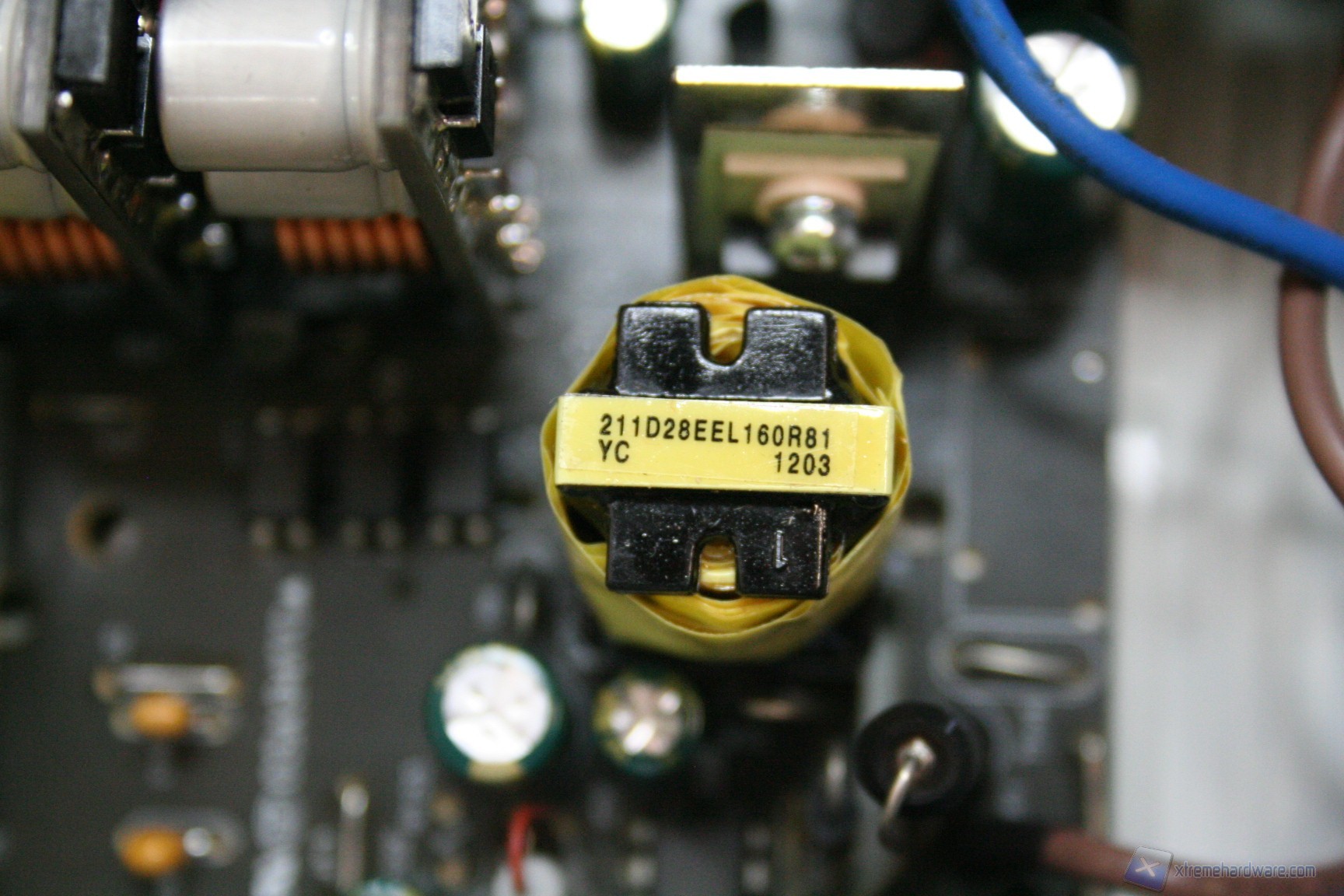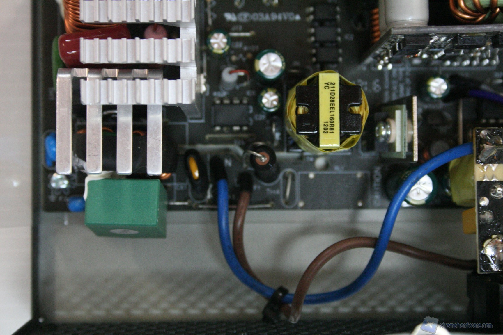 Nel primario è presente un solo condensatore elettrolitico Teapo, non giapponese quindi, avente le seguenti caratteristiche: 400V, 390μF, 85°C, similmente a quanto trovato in modelli dal simile wattaggio. I condensatori del circuito primario agiscono come buffer e sono molto importanti perché la loro presenza aiuta a proteggere il nostro alimentatore ed il computer stesso da pericolosi sbalzi di tensione, e generalmente vengono collegati in parallelo al fine di sommare le singole capacità, o alternativamente – per modelli meno potenti – vengono utilizzati singoli condensatori aventi anche 390μF, come in questo caso. Ci saremmo aspettati una tipologia migliore, d’altra parte, però, la topologia two-transistor forward è buona e permette risultati degni di alimentatori per sistemi di fascia alta.