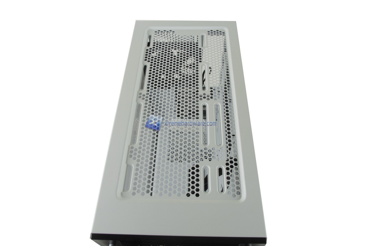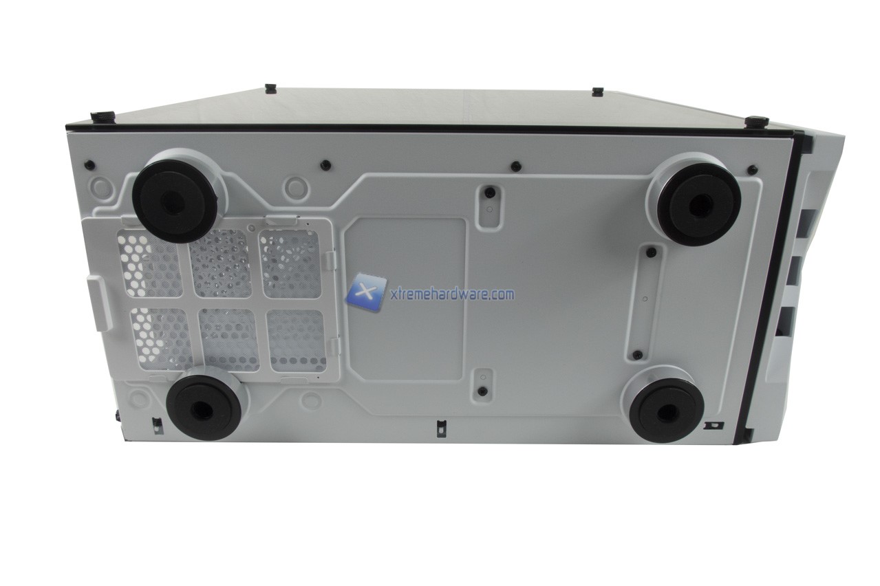 Dal retro passiamo al solito lato inferiore che ci mostra quattro piedini con pad antiscivolo di forma circolare e colore argento che ben si intona alla colorazione Bianca con qualche inserto e dettaglio Nero. Non passa inosservato il filtro del PSU che potremo sfilare per eventualmente pulirlo.