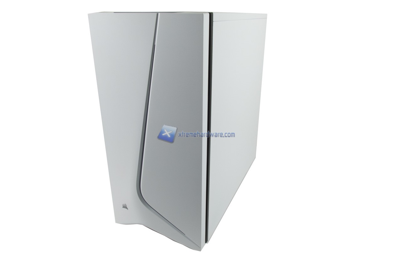 Il frontale è super pulito e classico. Non è presente come ormai da tempo alcun Bay per unità da 5,25 pollici. L’unico dettaglio ed elemento che ‘’sposta’’ l’attenzione è questa leggera ‘’fenditura’’ da cui verrà irradiato il colore con relativo ed eventuali effetti da voi scelto. Nella parte inferiore troviamo anche il logo Corsair ad aggiungere ulteriori dettagli.