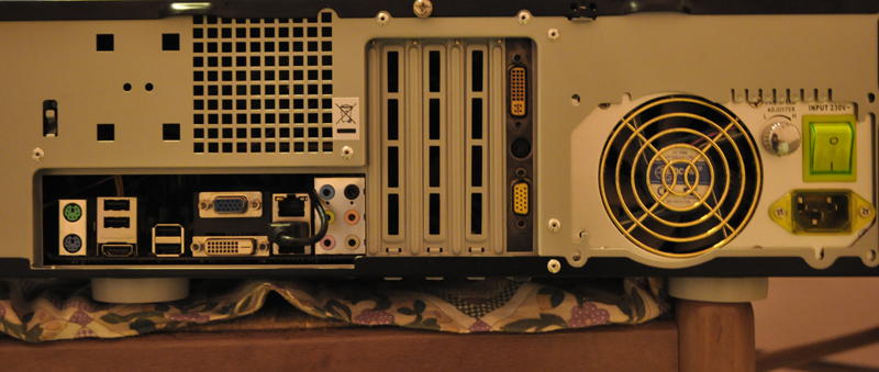 Infine troviamo a destra il vano per alloggiare un alimentatore ATX, nel nostro caso abbiamo optato per uno con ventola da 80mm. Notiamo anche sporgere due dei quattro piedini in gomma antiscivolo che permettono di appoggiare il case sopra ogni superficie senza problemi.