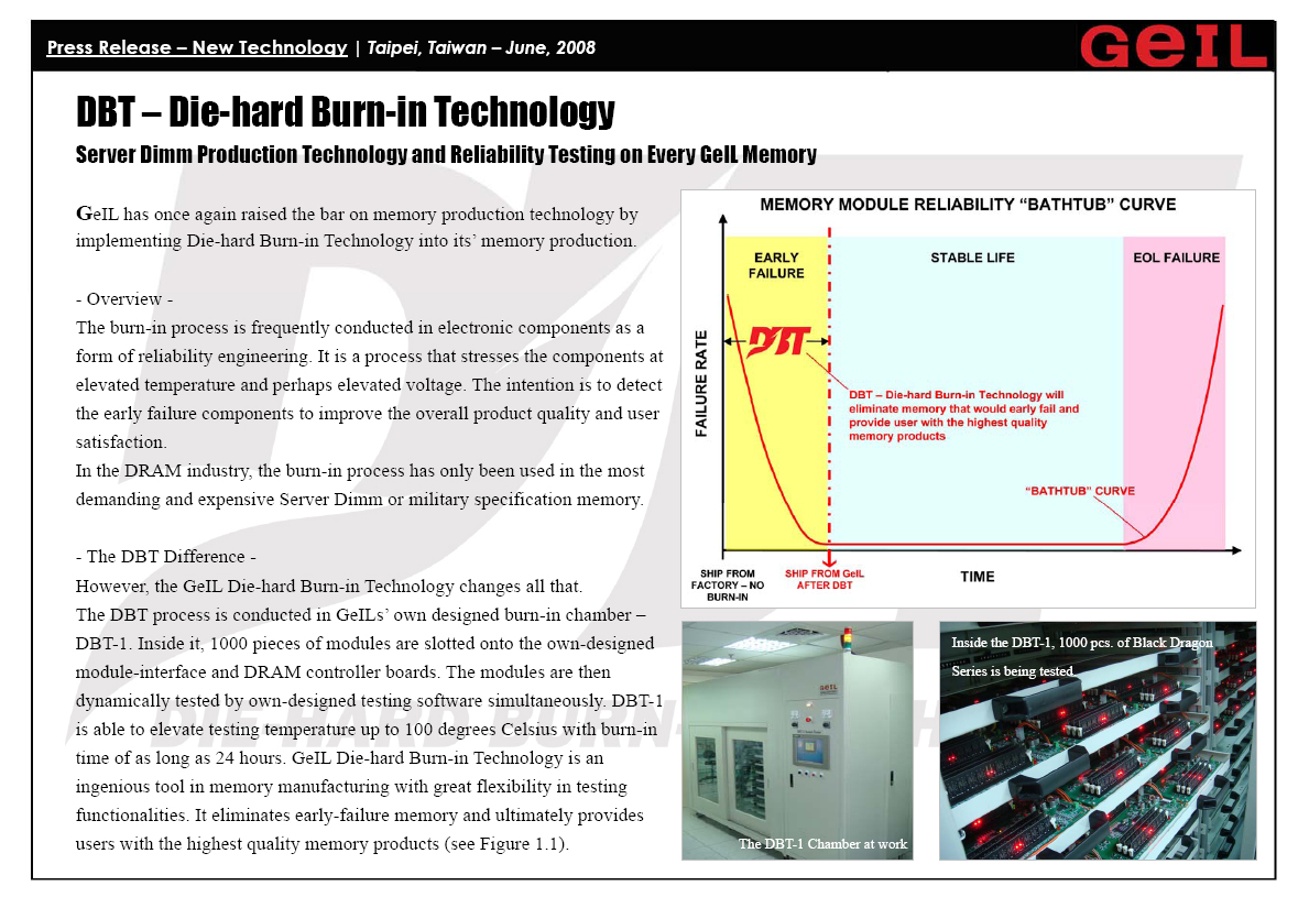 Altra tecnologia molto interessante delle memorie GeIL della serie EVO TWO è la cosiddetta tecnologia DBT (Die-hard Burn-In Technology), con la quale ogni singolo modulo memoria viene testato con particolari apparecchiature. Ogni modulo viene sottoposto ad un severo controllo durante il funzionamento, in particolare viene portato ad una temperatura sino a 100 gradi centigradi. In questa maniera viene assicurato che i moduli testati con questa particolare tecnologia non possono presentare malfunzionamenti e al contempo stesso si garantisce che le memorie non soffrano di malfunzionamenti o rotture nel primo periodo di utilizzo. Sicuramente stiamo parlando di un’altissima tecnologia di testing che non è affatto frequente in memorie pensate per utenti consumer, ma che solitamente è riservata a moduli che sono pensati per sistemi server e workstation. D’altra parte si capisce che sono memorie indirizzate ad un tipo di utenza più esigente, che cerca sempre di ottenere la massima soddisfazione dai prodotti acquistati, e GEIL sembra voglia soddisfarli pienamente. Ulteriori approfondimenti su questa tecnologia li potete trovare al seguente indirizzo: http://www.geil.com.tw/products/showTechnology/id/2