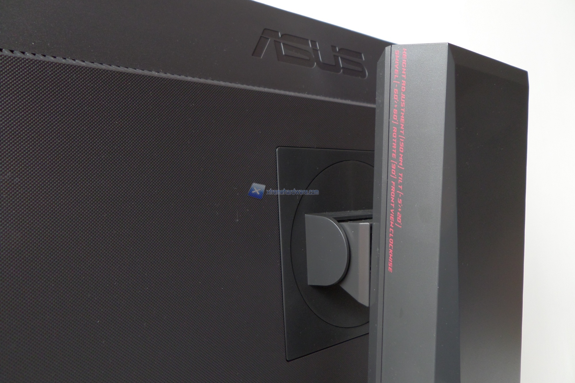 Posteriormente sono riportati i comandi fisici per l'OSD, con le rispettive indicazioni poste sulla cornice frontale. I cinque tasti presentano una forma e sporgenza alternata così da poter essere più facilmente riconosciuti al tatto. Il tasto rosso a 5 vie è invece un joystick che permette di navigare all’interno del menù OSD piuttosto facilmente. Nella parte posteriore sinistra è posizionato il connettore di alimentazione (l'alimentatore è integrato), mentre nella parte destra si hanno due porte HDMI 1.4, una porta HDMI 2.0, una DisplayPort e un'uscita jack audio da 3,5 mm.