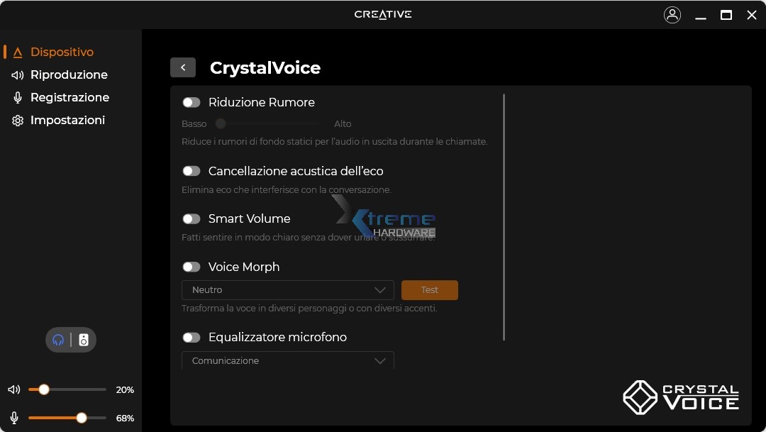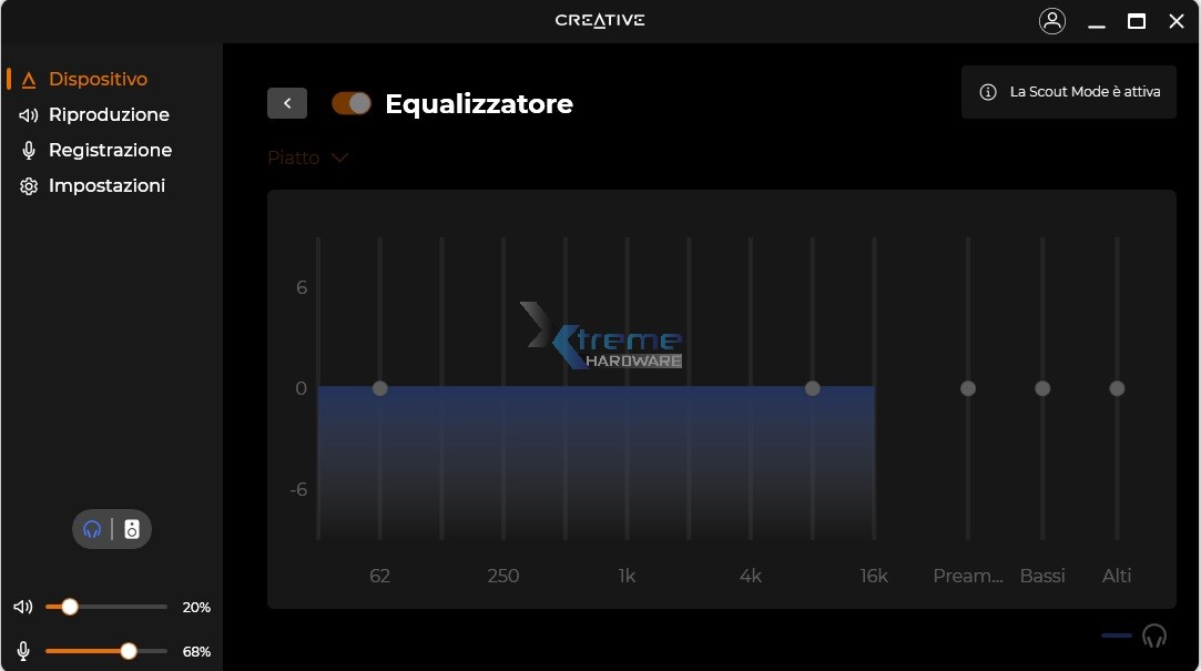Scaricandolo e avviandolo troviamo la consueta interfaccia organizzata in un pannello generale con al suo interno tutti i diversi sotto menu per la personalizzazione individuale delle modalità e opzioni per creare un suono ottimizzato a seconda dell’utilizzo che ne vorremo fare. L’interfaccia del software Creative APP potrà essere cambiata di colore (bianco o nero) di sfondo direttamente dalle impostazioni generali dove potremo decidere di eseguire il software all’avvio del PC oltre a controllare la disponibilità di versioni firmware e app aggiornate.