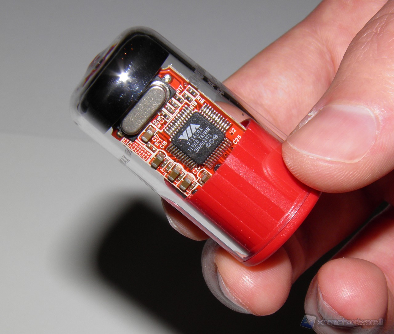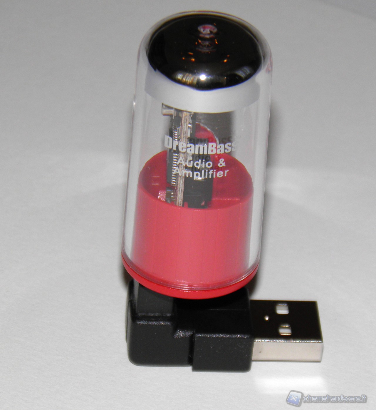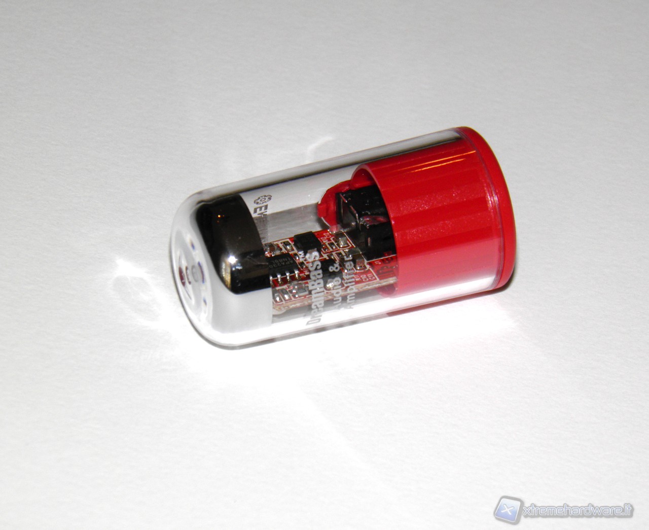 Analizziamo ora la piccola scheda audio. L'idea di riprendere le forme delle valvole, componenti per amplificatori molto apprezzati in campo audio, è stata trovata davvero una buona scelta, molto piacevole alla vista e caratteristica, rispetto ad altri prodotti simili che tendono a mantenere una forma più classica, simile alle pendrive.