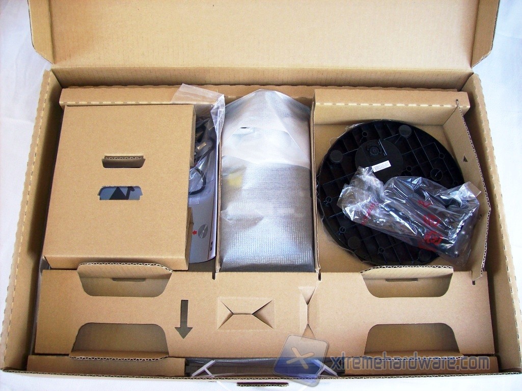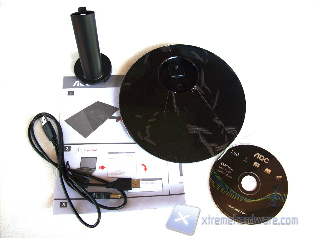 Rimossa la copertura, la scatola risulta solida e ben organizzata all’interno. Nello scompartimento di sinistra troviamo il CD, contenente il driver fornito da DisplayLink e il manuale del monitor, il cavo USB type A ad Y lungo 1 metro e la guida rapida all’installazione dell’AOC. Durante l’utilizzo in condizioni particolari un cavo più lungo poteva far comodo. In quello di destra è presente la base di appoggio ed il sostegno. Al di sotto, avvolto da una busta di plastica che lo protegge da graffi e polvere, troviamo il monitor.