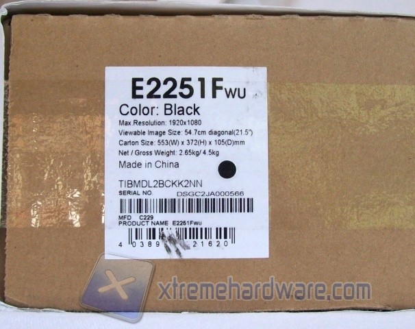 La confezione misura 560 x 380 x 110 mm e rappresenta in breve le caratteristiche del monitor. L’immagine sulla parte frontale ci informa subito per quali esigenze l’AOC e2251Fwu è indicato. Nella stessa viene riportato infatti il monitor, senza piedistallo, collegato ad un notebook in configurazione Duplica. Nella zona inferiore sono indicate le funzionalità quali la compatibilità con piattaforma PC e Mac, il sistema di retroilluminazione a LED, la connessione USB 2.0, la risoluzione Full HD 1080p, certificazioni ENERGY STAR 5.0, EPEAT Silver e l’assenza di mercurio.