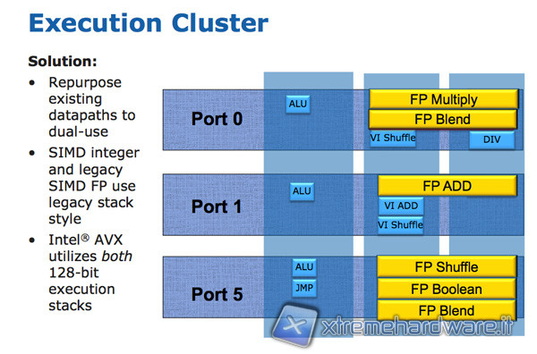 In primo luogo, infatti, Intel ha sfruttato la struttura a matrice del cluster di esecuzione, caratterizzato da 3 porte e 3 stack a 128 bit, per eseguire anche le istruzioni AVX a 256bit, semplicemente combinando i due datapath a 128 bit delle unità SIMD per gli interi e delle unità SIMD per le istruzioni Floating Point.