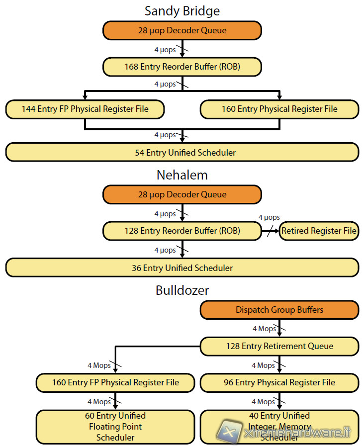 L’adozione dei PRF è presente anche nell’architettura Bulldozer di AMD, ma in Bulldozer troviamo uno scheduler separato per operazioni in Floating Point e per operazioni su Interi.