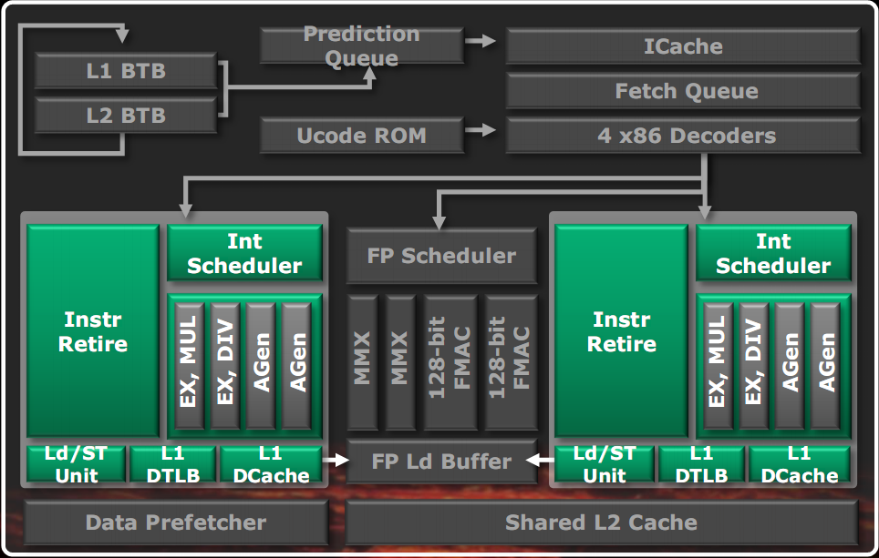 Ognuno dei due core è dotato di uno scheduler unificato delle istruzioni, capace di eseguire le istruzioni non appena i dati e le unità esecutive necessarie sono pronte. Le unità di esecuzione sono 4, di cui due capaci di eseguire istruzioni di calcolo indirizzo e istruzioni aritmetico logiche semplici (AGen), una in grado di eseguire istruzioni aritmetiche complesse, nonché moltiplicazioni (Ex, MUL) ed una in grado di eseguire istruzioni aritmetiche complesse, nonché divisioni (Ex, DIV). Ogni unità è dotata di una cache dati L1 da 16KB, con politica di scrittura write through e prevalentemente esclusiva rispetto alla cache L2, di una TLB dati da 32 pagine fully associative e una unità di load/store completamente out of order, capace di eseguire due letture a 128 bit e una scrittura a 128 bit per ciclo, con una coda di 40 posizioni in lettura e 24 in scrittura.