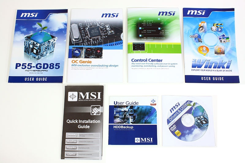 Nella confezione, una volta aperta la scatola della nostra scheda madre, troviamo 4 cavi Sata, un cavo EIDE, due cavi di alimentazione per Molex-Sata, bridge di collegamento per l'installazione di due schede grafiche uno per Ati CF e l'altro per Nvidia SLi, cavi V-Ceck per i punti di misurazione dei voltaggi direttamente sulla scheda madre nei punti V-Ceck, USB 2.0 Bracket da collegare sul restro dle case, mascherina di I/O da installare nel case, ed i vari manuali come guida per l'uso utente, manuale per l'Oc Genie, manuale del Sw Control Center, guida all'uso Winki, manuale installazione rapida ed una guida all'uso dei back-up degli hdd.