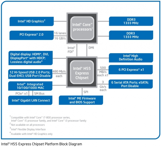 Il chipset Intel® H55 Express presenta una nuova architettura progettata per garantire qualità, prestazioni e tecnologie di I/O leader nel settore delle piattaforme che utilizzano i processori Intel® Core™ i7 serie 800, Intel® Core™ i5 e Intel® Core™ i3. A differenza del P55 Express, questo è in grado di gestire la grafica integrata (Intel GMA HD) dei processori Intel Clarkdale.