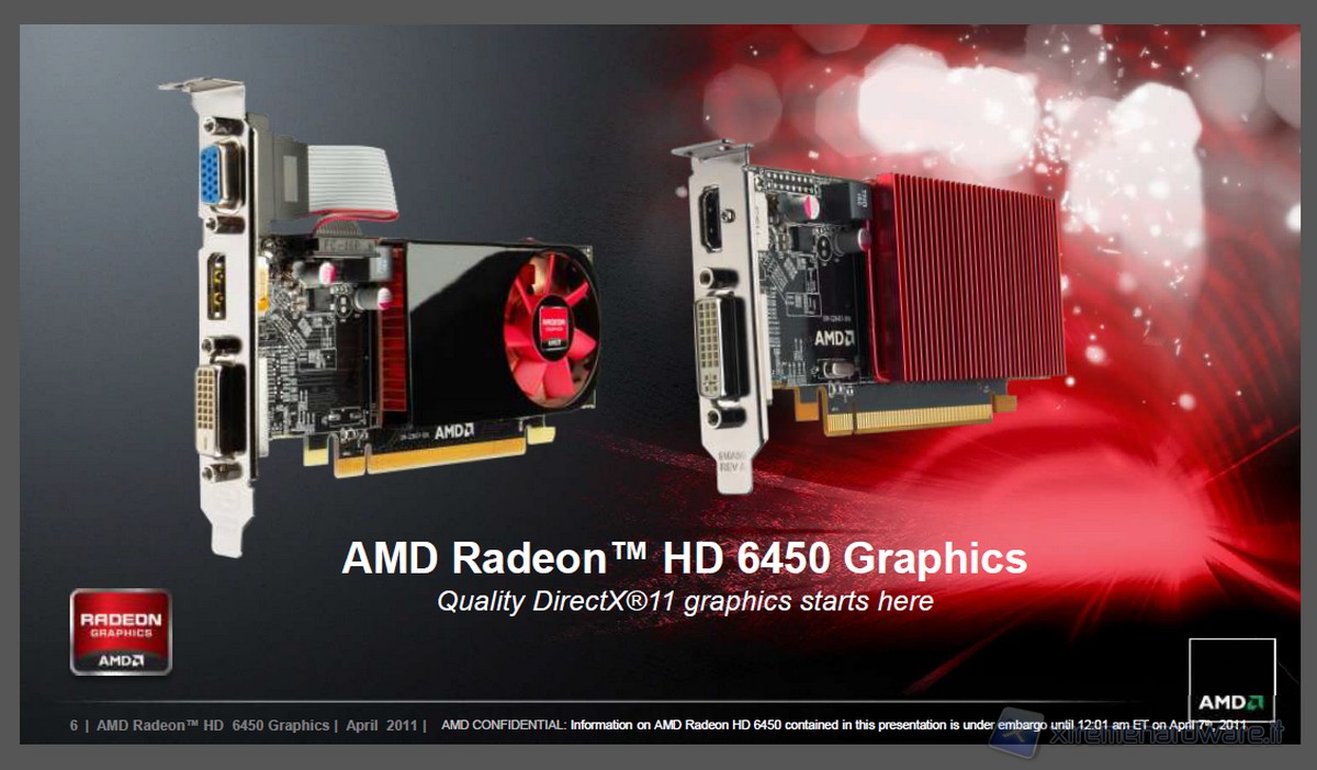 Radeon_HD_6450_VGA2 Oggi AMD propone agli utenti finali una nuova scheda video, la Radeon HD 6450, con nome in codice CAICOS. Una scheda grafica di fascia entry level con tecnologia produttiva a 40nm e pieno supporto alle ultime librerie di casa Microsoft, le DirectX 11. La scheda  è dotata di caratteristiche avanzate interessanti.