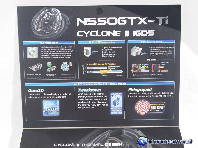 Abbiamo notato tuttavia che lo stesso packaging interno è adottato anche per altre schede video MSI, infatti la N550GTX-Ti Cyclone è qualche centimetro più corta rispetto allo spazio presente ed è assicurata con altri due pezzi di poliuretano aggiuntivi, abbiamo confermato ciò confrontando la confezione della N550GTX-Ti Cyclone con la confezione di una N560GTX-Ti Twin Frozr II.