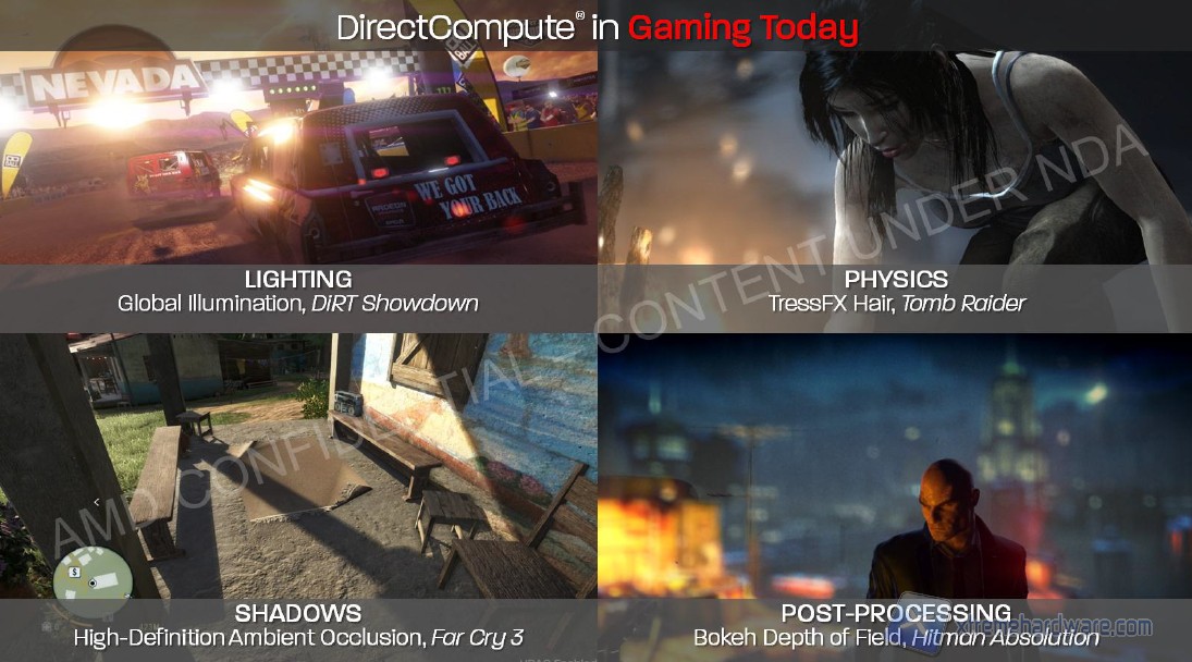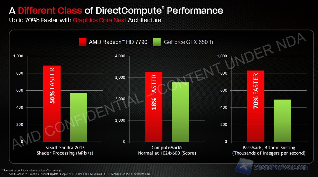 Dal punto di vista delle performance in ambito DirectCompute il terreno di sconto è la rivale NVIDIA GeForce GTX 650 Ti dove la scheda prodotta da AMD sembra avere un vantaggio tangibile sulla rivale, si arriva a sfiorare ben un 70% in più come performance. Molto interessante è anche la capacità di calcolo nel DirectCompute negli attuali giochi come illuminazione globale in Dirt Showdown, la fisica della tecnologia TressFX nel nuovo gioco Tomb Raider, la gestione delle ombre in Far Cry 3, gli effetti di post processing in Hitman Absolution.