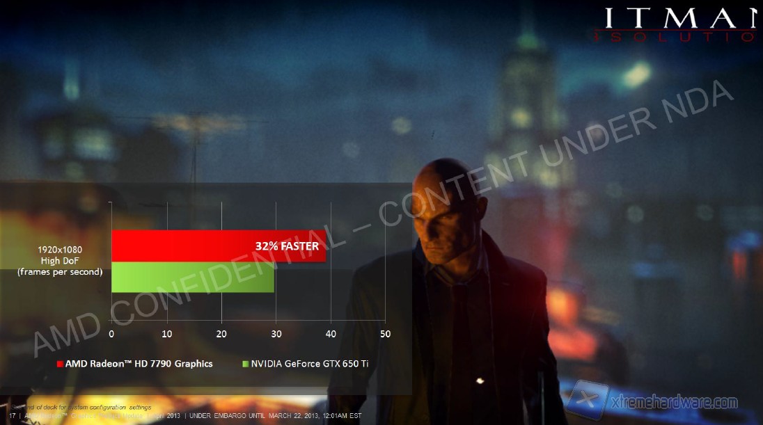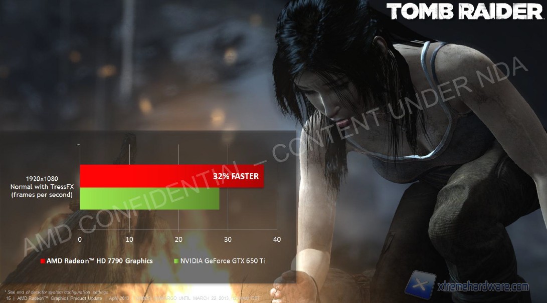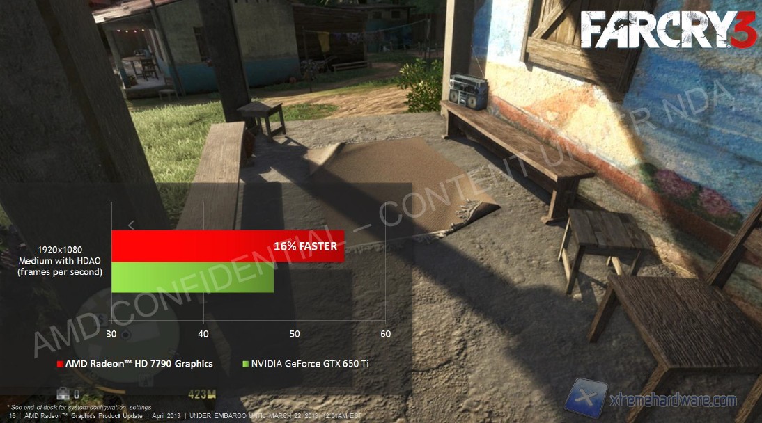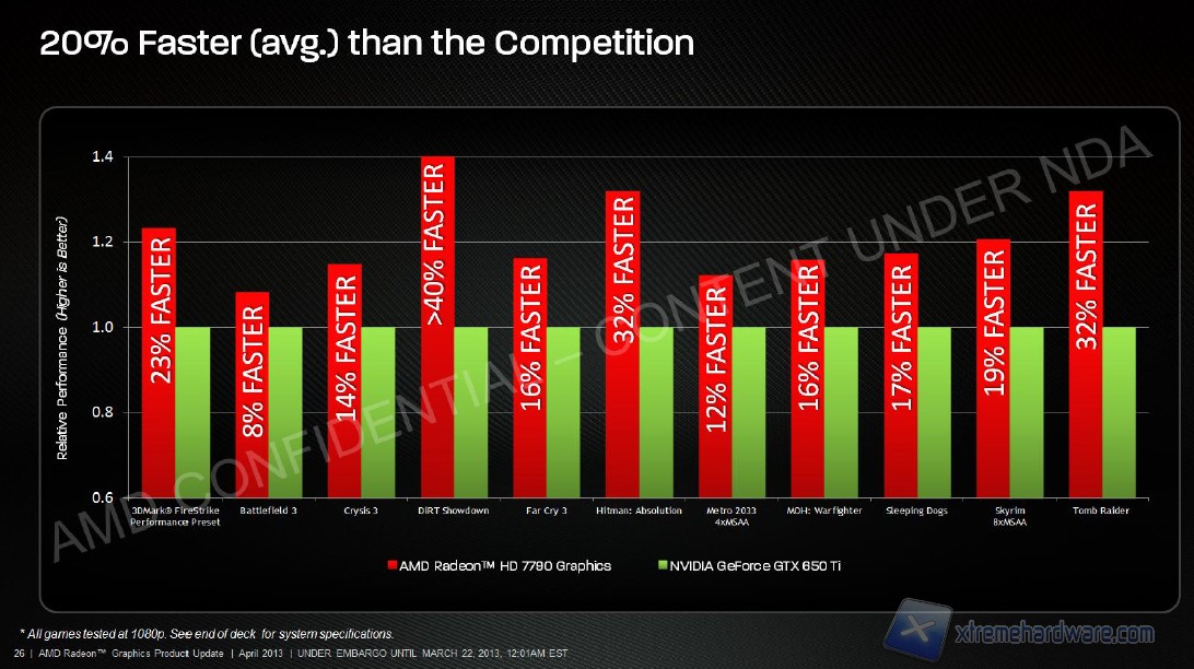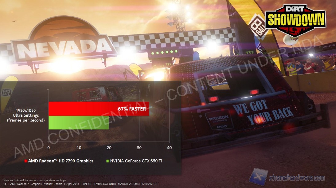 Molto interessanti appaiono le prestazioni con la singola VGA nei più moderni giochi dove dal punto di vista di frame per secondo il vantaggio verso la rivale NVIDIA è davvero notevole, in alcuni casi come Dirt Showdown arriviamo ad un eccezionale +67%, mentre negli altri game il vantaggio è meno marcato ma pur sempre cospicuo. Mediamente secondo un'analisi svolta internamente da AMD la nuova GPU Bonaire mantiene un vantaggio di circa il 20% sulla NVIDIA GeForce GTX 650 Ti.