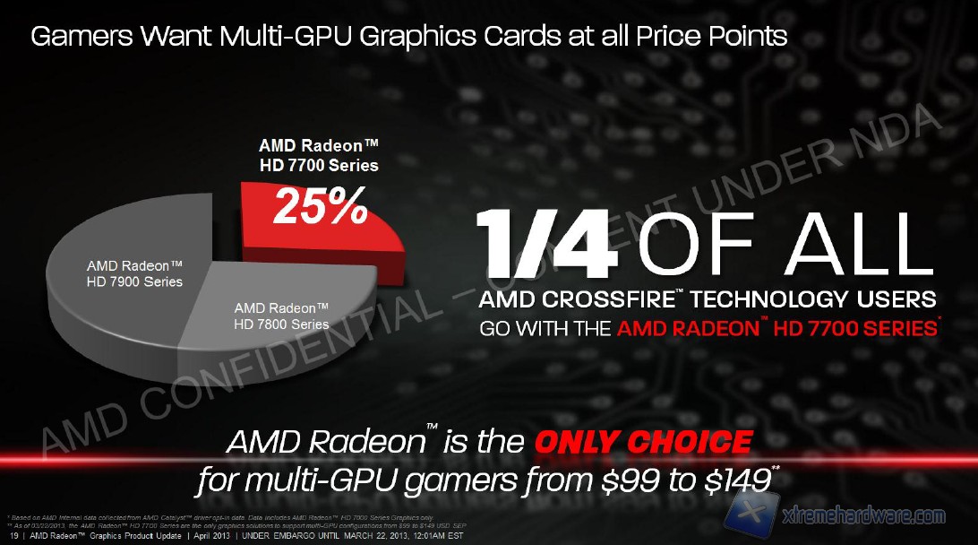 Molto interessante appare l'uso di questa nuova scheda grafica in modalità multi GPU, infatti come possiamo vedere sopra, la fetta di schede AMD Radeon HD 7700 Series rappresenta ben il 25% del totale delle VGA che usano la tecnologia CrossFire e questo sarà ancora più conveniente adesso con la Radeon HD 7790 che nella fascia tra i 100$ e 149$ è indubbiamente il miglior acquisto.
