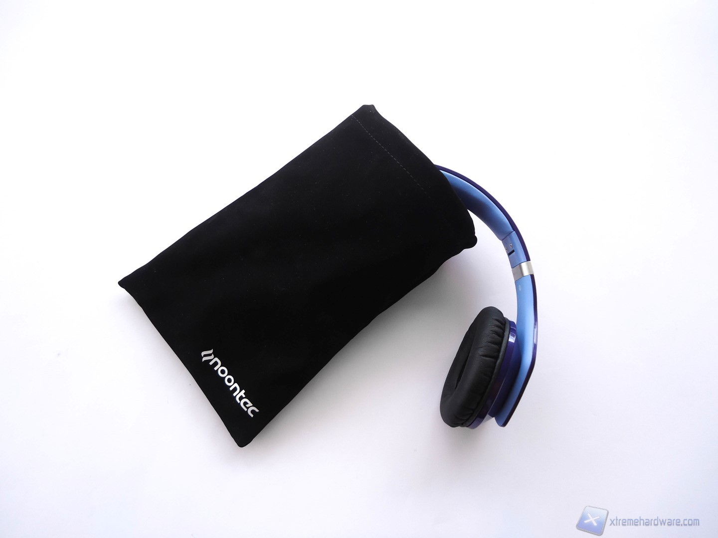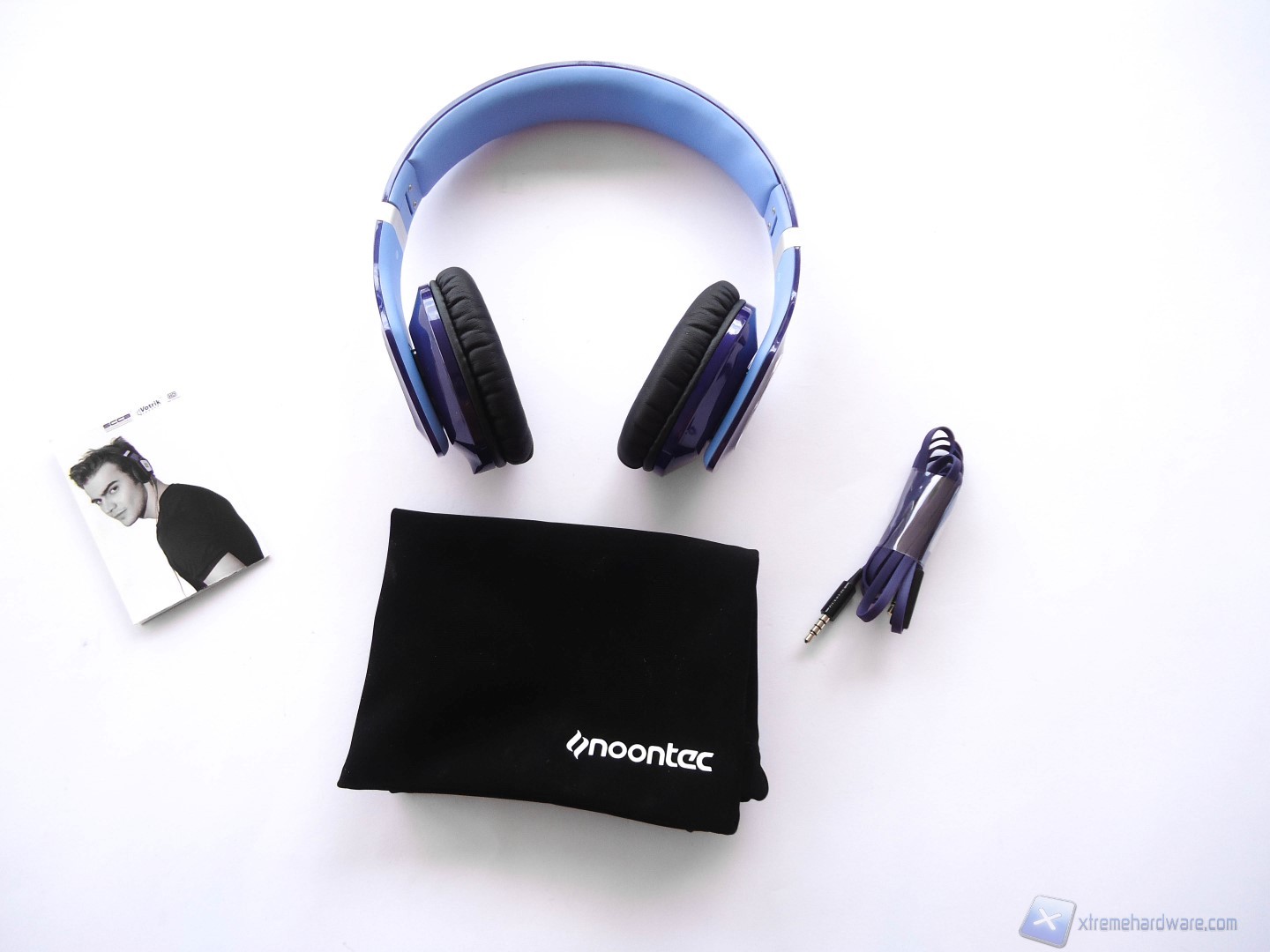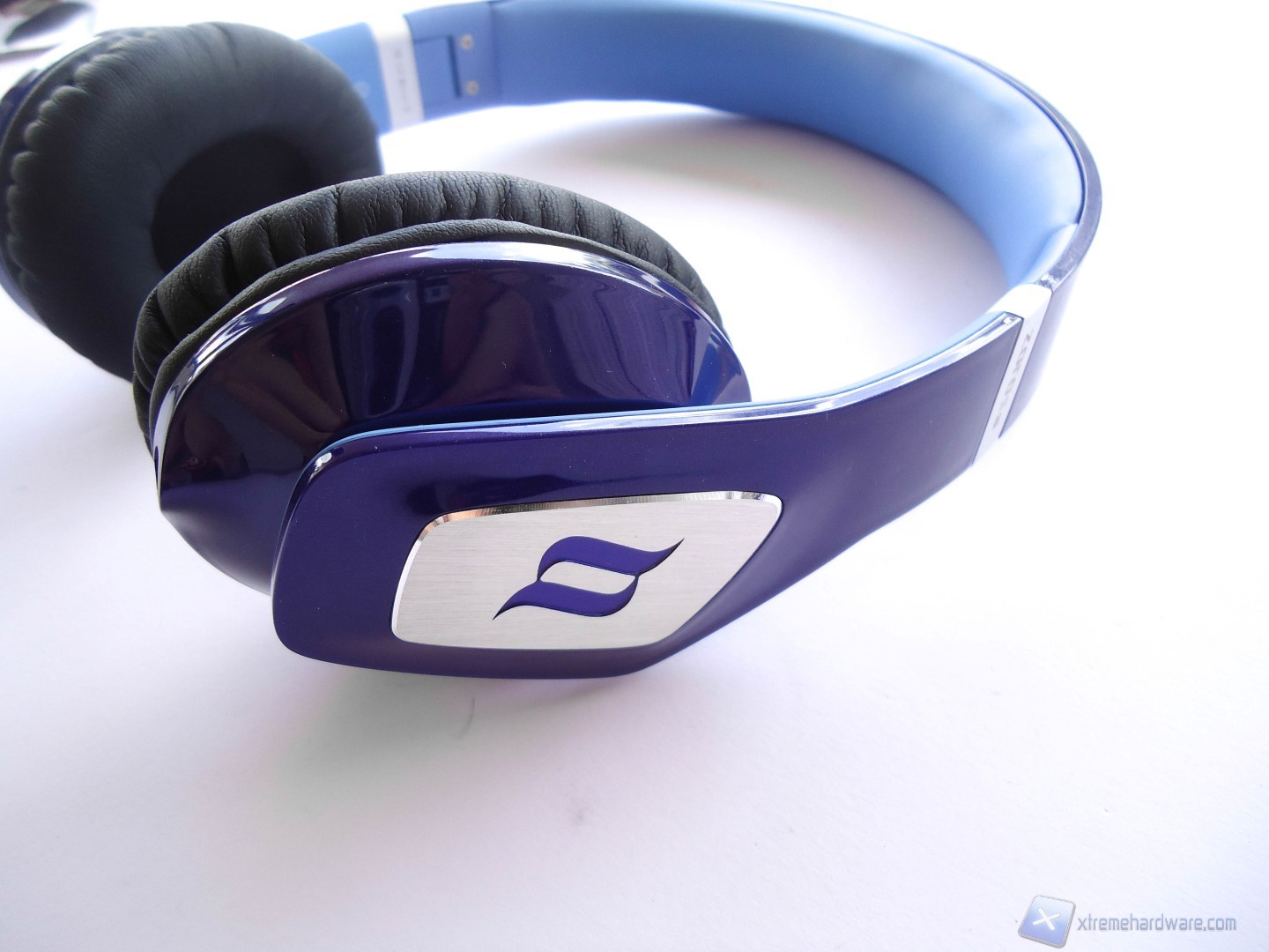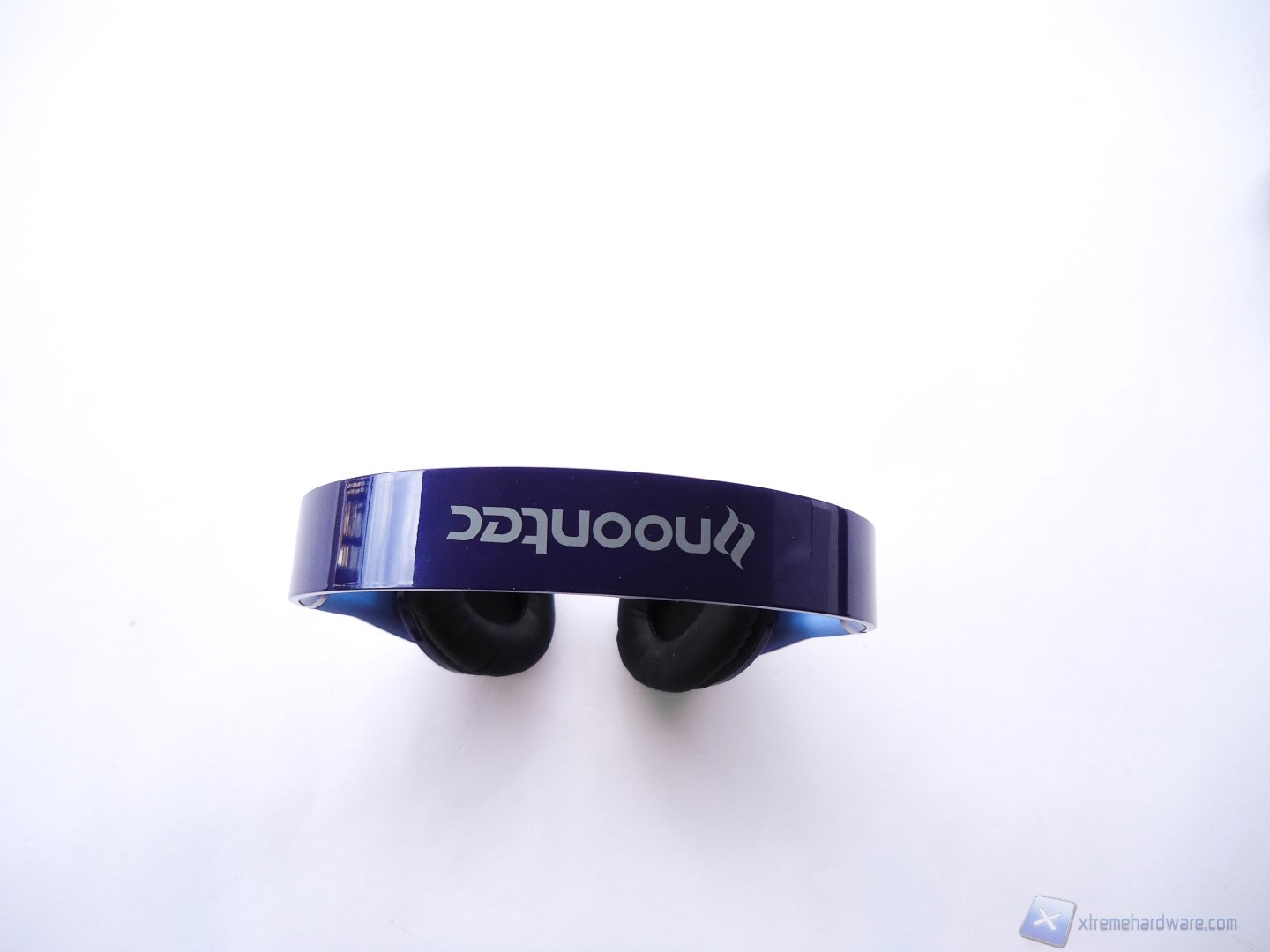 Partiamo dall’analisi dell’archetto, realizzato in plastica con all’interno un’anima di acciaio per conferire una maggiore resistenza e rigidità. Al di sopra dell’archetto troviamo stampato il logo Noontec in una colorazione grigia lucida come lucida è il resto della colorazione delle cuffie. L’imbottitura al di sotto è minima e rivestita in pelle ma essendo le cuffie molto leggere è più che adeguata. Più in basso troviamo il sistema che permette alle cuffie di ripiegarsi. Vicino a questo punto notiamo una placchetta in metallo che da una parte riporta il nome del prodotto mentre dall’altra vi è inciso sopra che le cuffie sono state progettate in Italia e realizzate in Cina. Ancora più in basso sono presenti le lettere R e L che ci permettono di distinguere i lati delle cuffie.