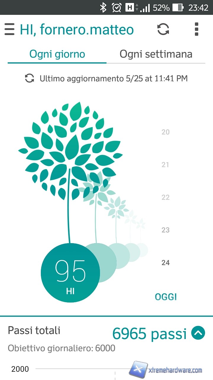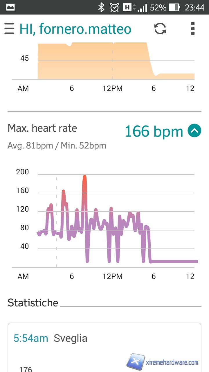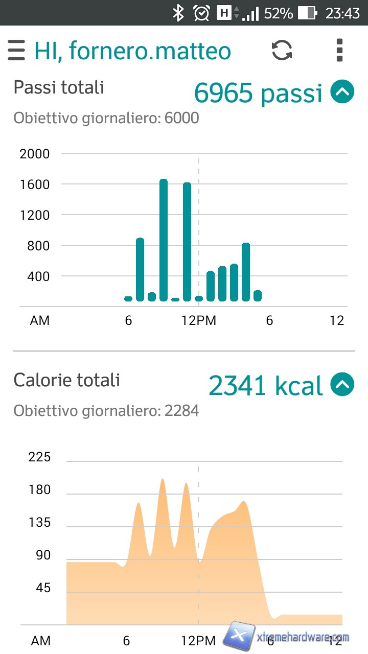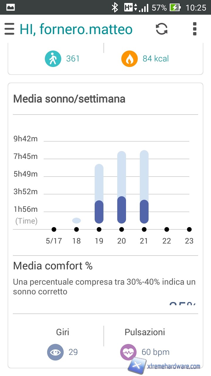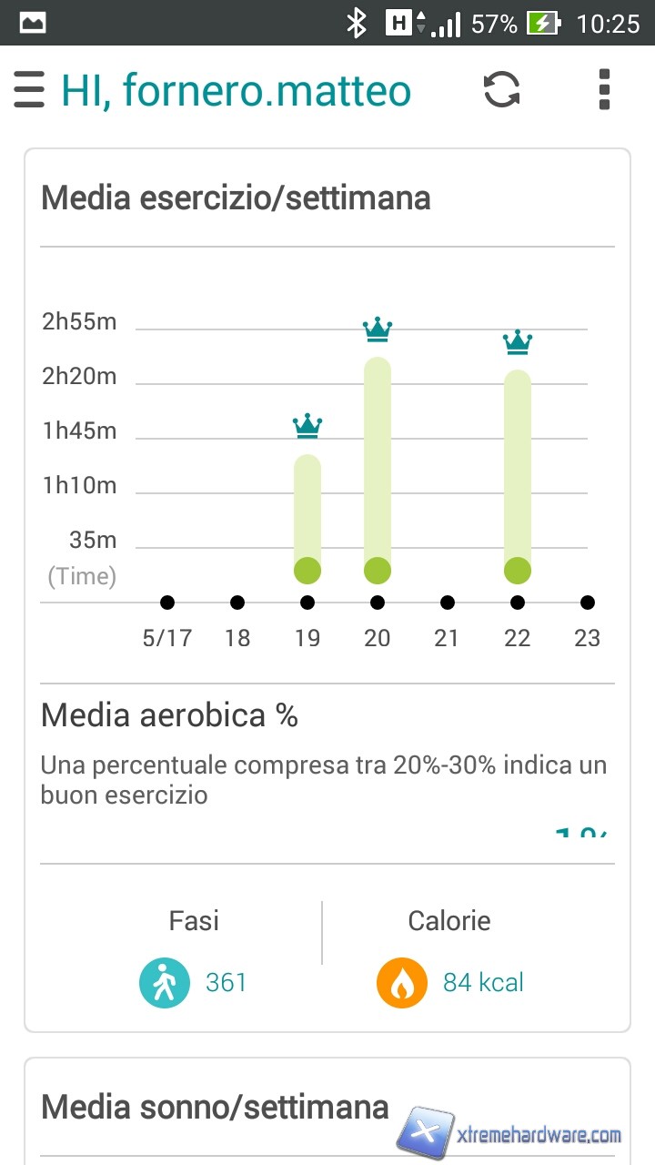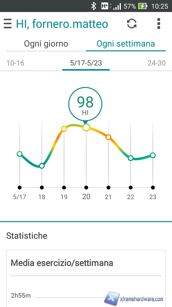 L’app di Asus è disegnata piuttosto bene, ci sono alcuni aspetti grafici che si potrebbero migliorare ma nel complesso è davvero molto interessante perché permette di avere una panoramica complessiva con tanto di grafici e valori precisi relativi alla nostra attività fisica, alle calorie consumate ed alle ore di sonno. Risulta molto semplice e veloce anche il passaggio tra differenti date del calendario, in modo da poter analizzare la nostra attività fisica o il nostro sonno anche a giorni di distanza. Possiamo inoltre decidere di visualizzare i dati del Vivowatch non su base giornaliera ma settimanale in modo da avere grafici più generali ed a lungo termine su quelle che sono le nostre attività.