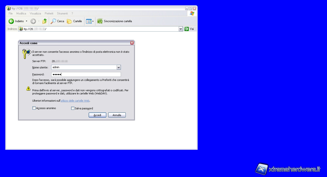 Per accedere all’unità è sufficiente inserire nella barra del percorso di una cartella l’indirizzo IP del NAS, preceduto dal protocollo: ftp://28.xxx.xxx.xxx
