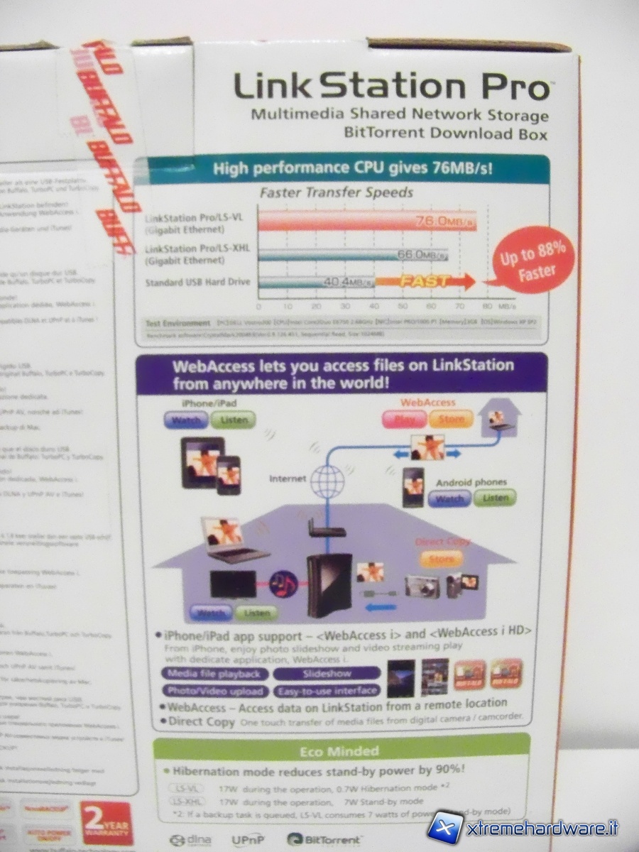 Apriamo la scatola del LinkStation Pro, notiamo che all’interno vi è un cartone sagomanto che protegge il Nas da eventuali urti e gli impedisce qualsiasi movimento durante il trasporto.