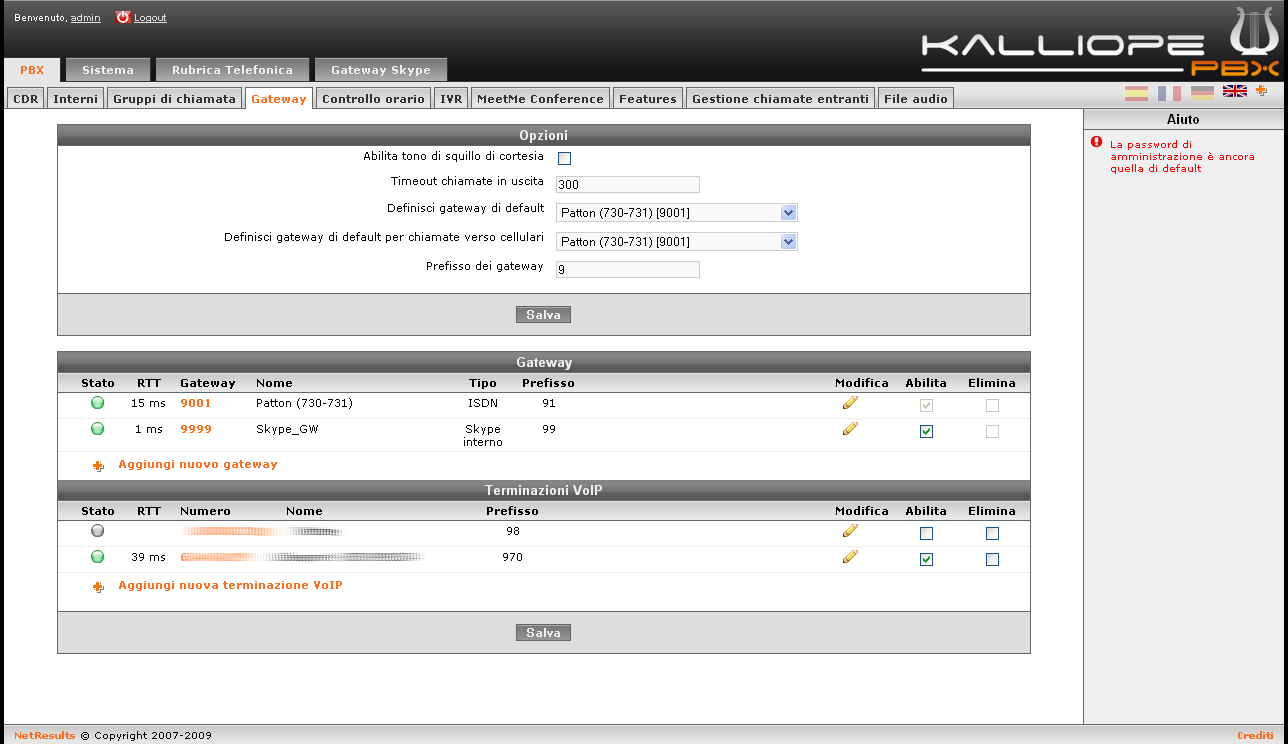 Il menu Gateway è una parte fondamentale nella configurazione del Kalliope PBX: in questa sottosezione vengono configurati i gateway che verranno utilizzati per interconnettere il centralino con la rete telefonica tradizionale.